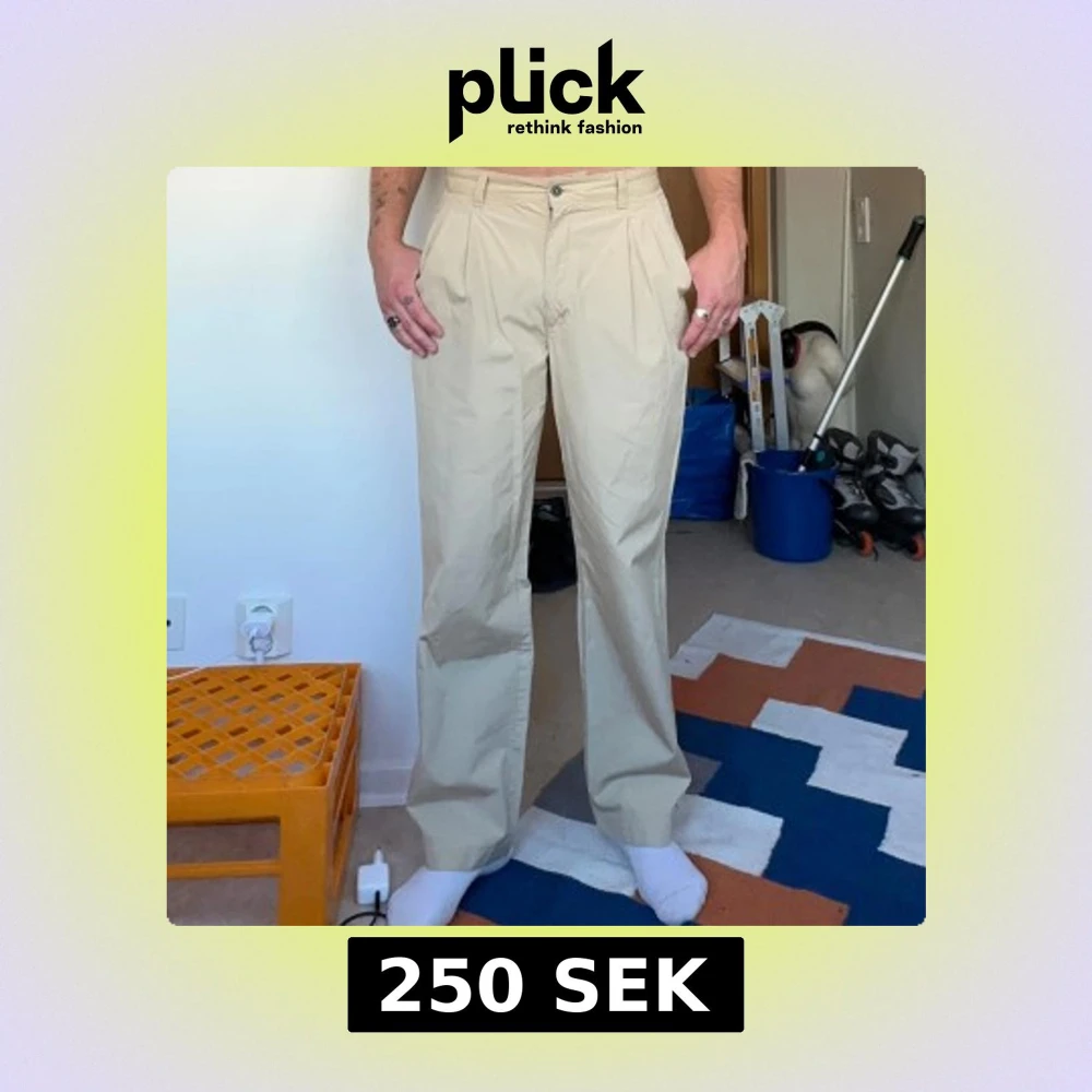 Snygga beiga chinos från Boomerang i 100% bomull. Klassisk rak passform med pressveck, hällor för bälte och knäppning fram. Fickor både fram och bak, diskret logga ovanför bakfickan. Perfekta för en clean och stilren look. Finns en orange fläck på vänstra baksidan, inget som märks vid användning. Ska försöka få bort i tvätt. De sitter som en W32 L32