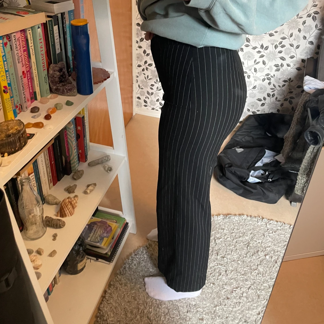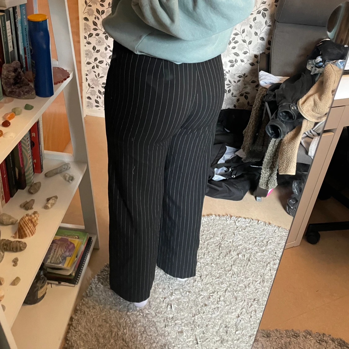 Kostymbyxor från bershka i storlek 36. Passar bra för längd 162 cm. Sköna byxor med ränder. Byxor har använts några gånger men är i bra skick. Svart med vita ränder.