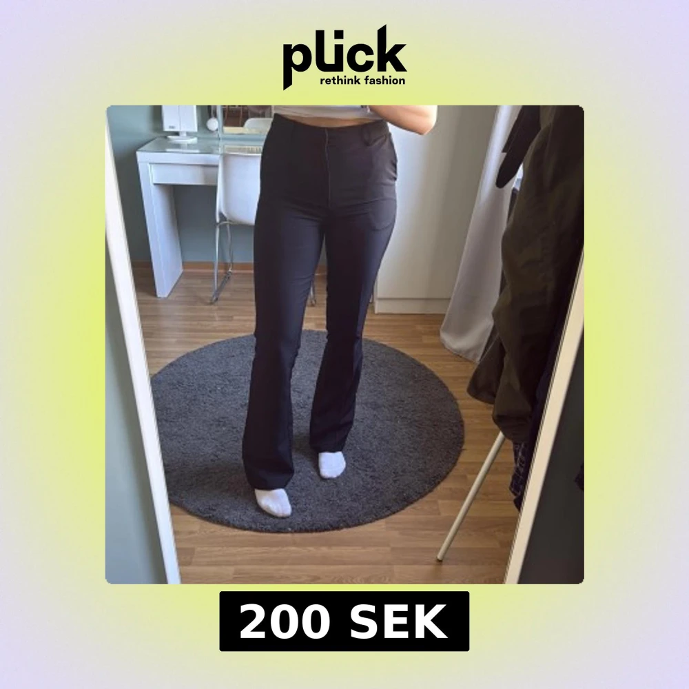 Säljer ett par svarta kostymbyxor från BikBok med bootcut-passform och hög midja. Byxorna har en klassisk look med slät framsida och lätt utsvängda ben. Perfekta för en stilren och trendig outfit. Dom är u modellen Wilma tall, jag är 179cm med långa ben💕