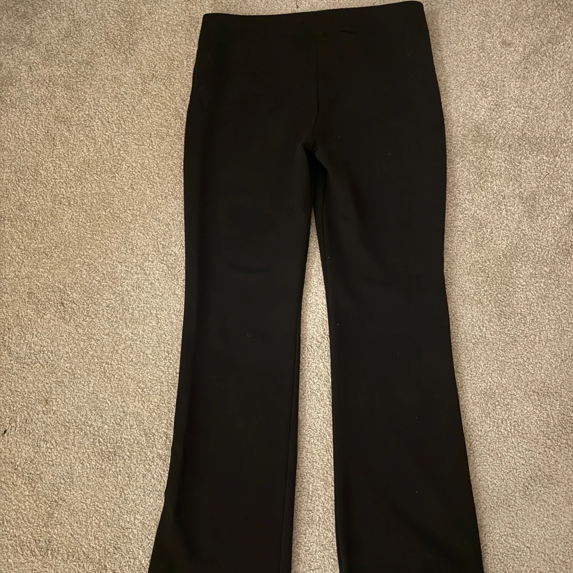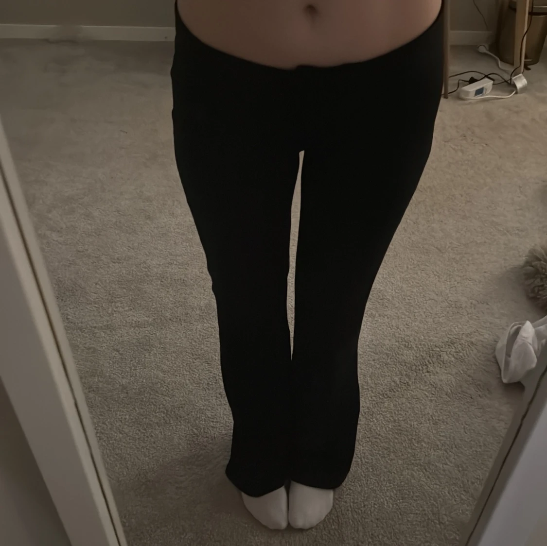 Säljer ett par svarta bootcut byxor med skön stretch och låg midja. De har en tight passform upptill och släpper ut vid bensluten för en snygg siluett. Perfekta till sneakers eller boots och superenkla att styla till olika looks.