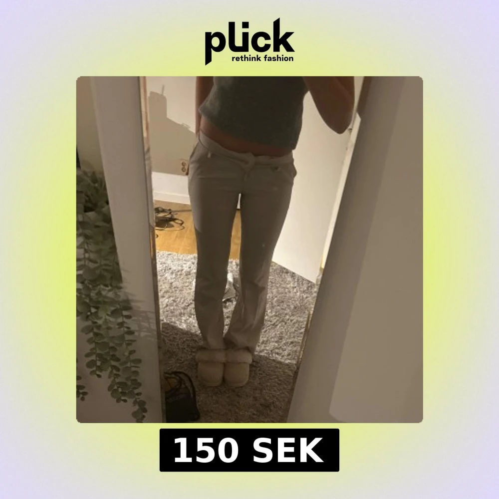 Snygga beige kostymbyxor med bootcut och låg midja. Byxorna har fickor fram och bak samt hällor för bälte. Perfekta för en clean och stilren look. Materialet känns mjukt och följsamt, vilket gör dem bekväma hela dagen.