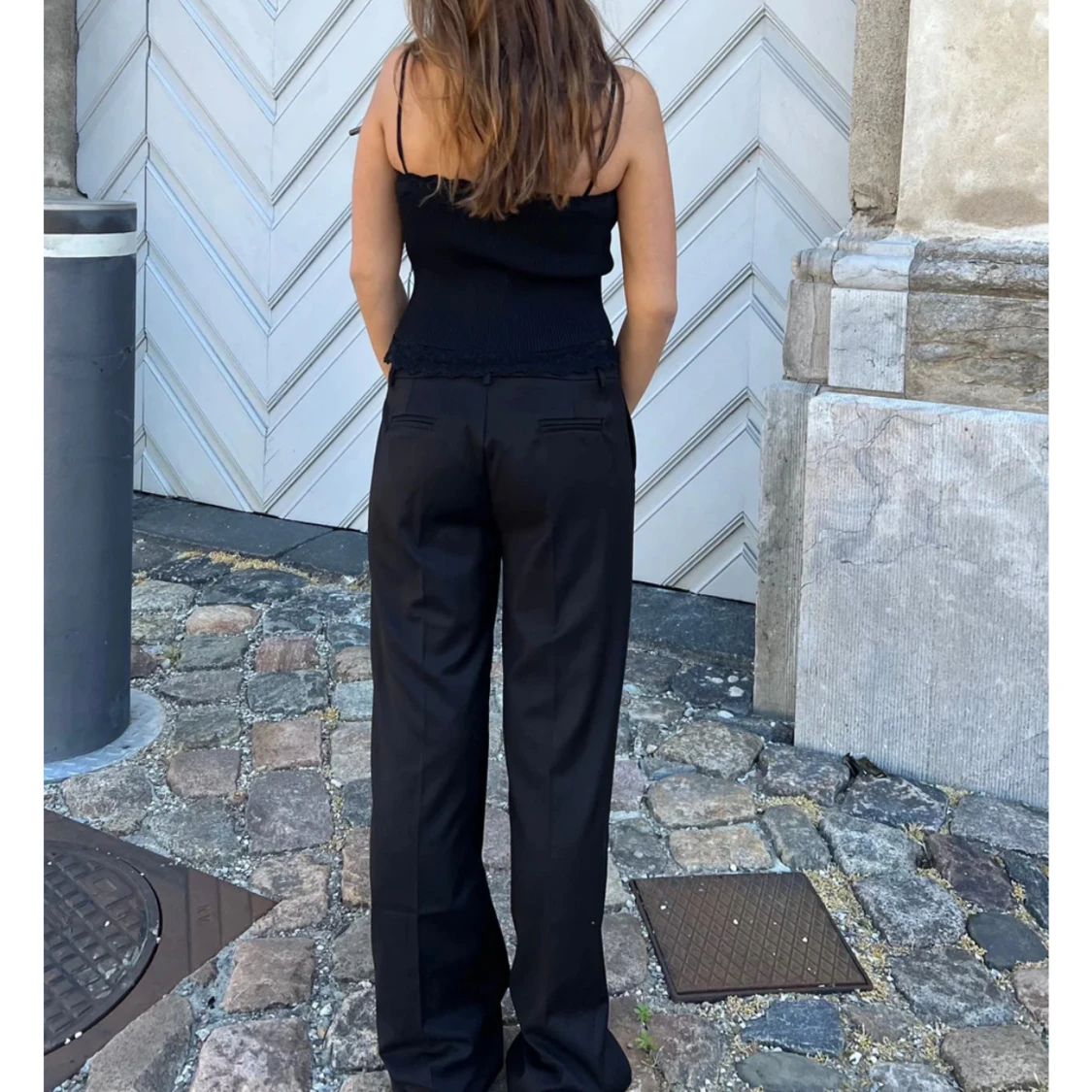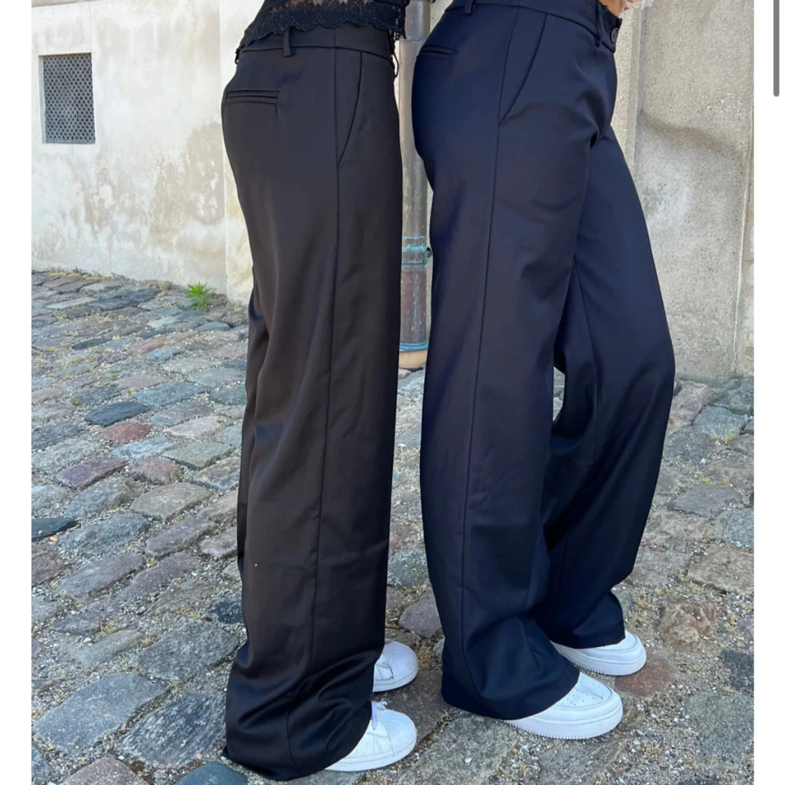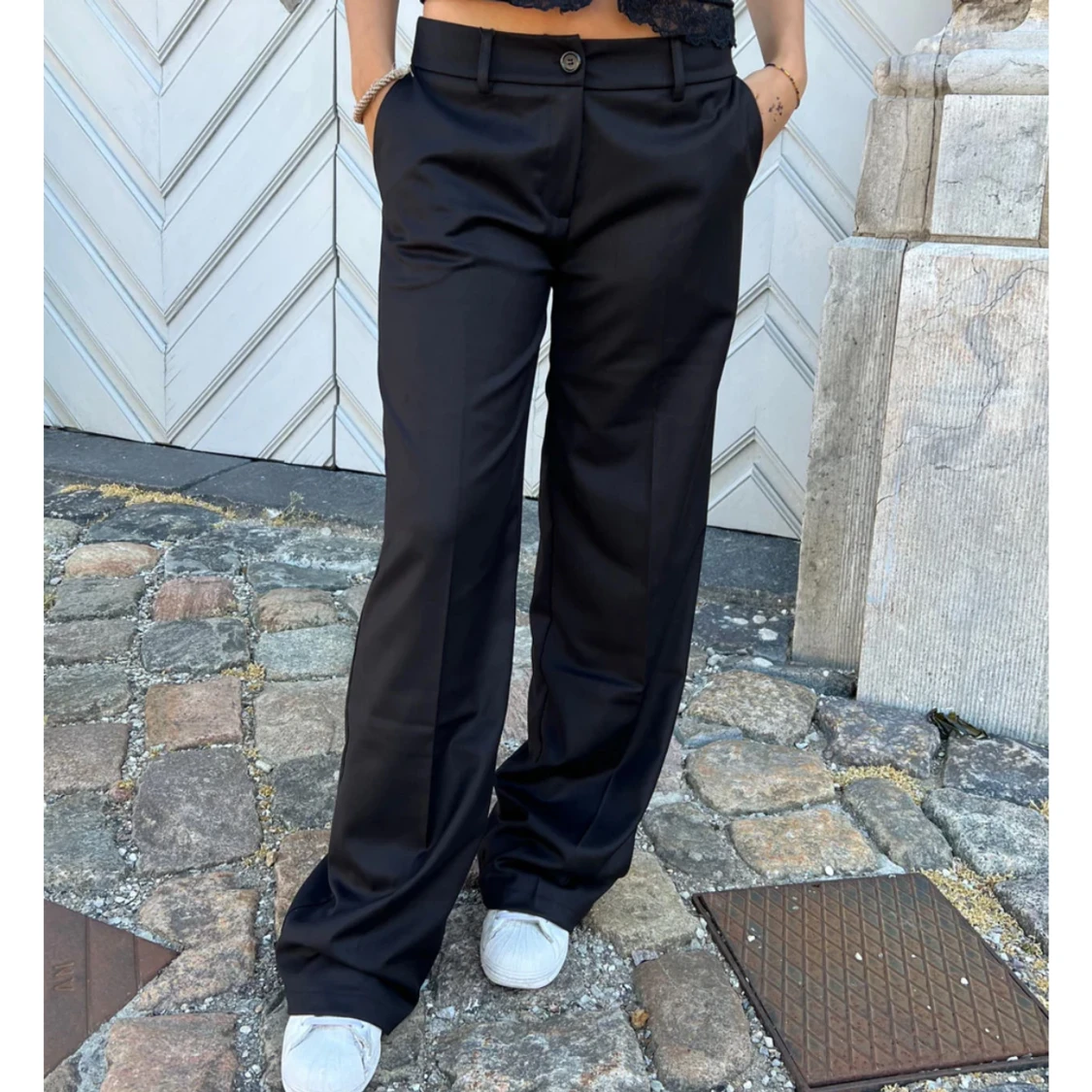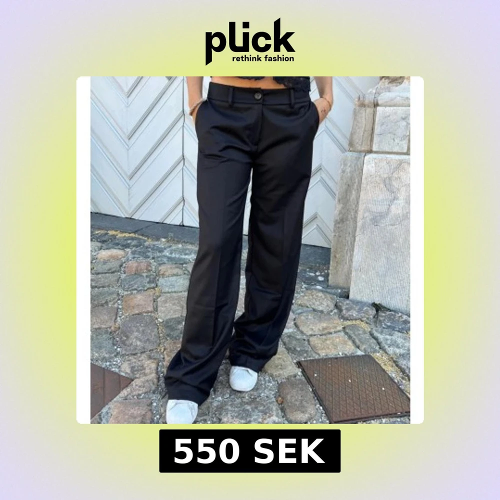 Snygga svarta kostymbyxor med vida ben och klassisk passform. Byxorna har låg midja, hällor för bälte, knapp och dragkedja framtill samt fickor på sidorna och bak. Perfekta för en clean och stilren look. Materialet känns mjukt och har en lätt glans. (Säjer då de inte kommer till användning)