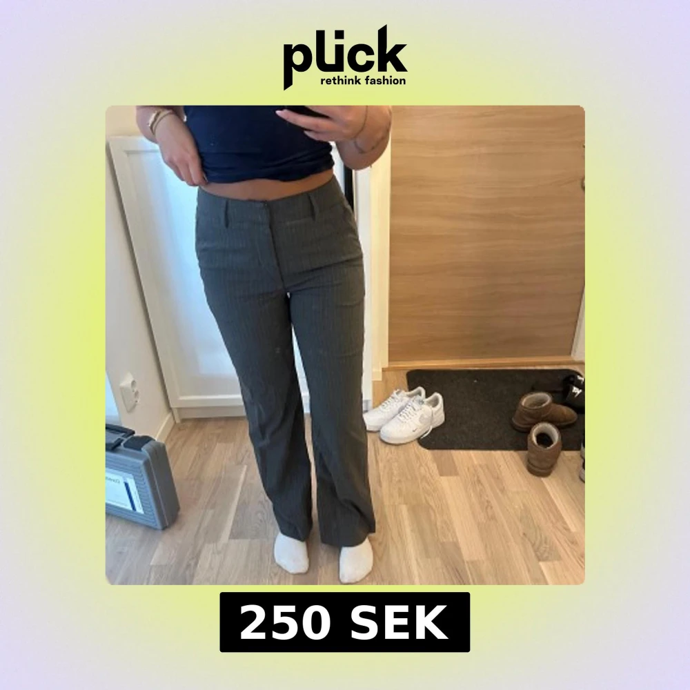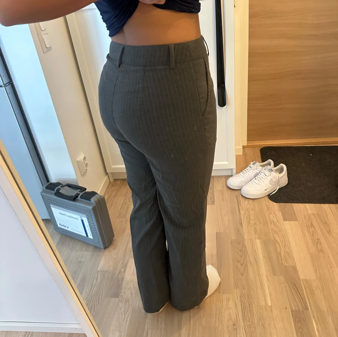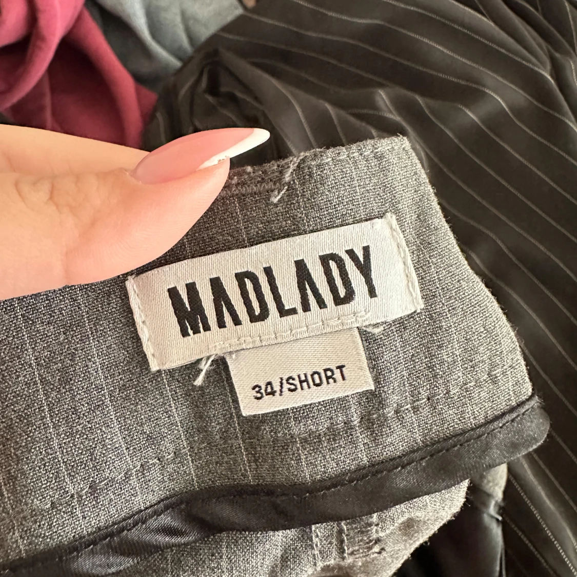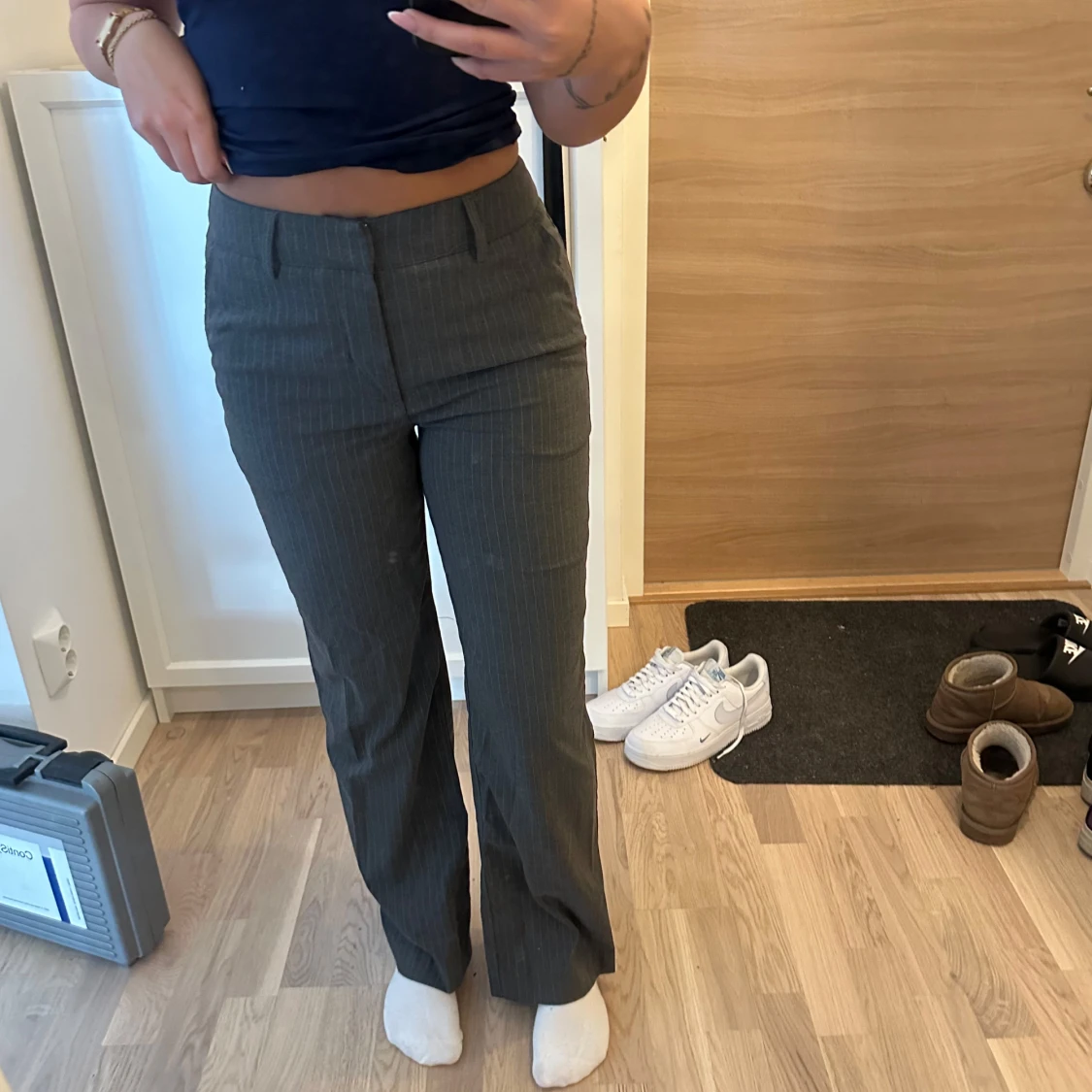 Snygga grå kostymbyxor från Madlady med diskreta ränder. Byxorna har en klassisk design med hög midja och raka ben, perfekt för en stilren look. De är tillverkade i ett bekvämt material som ger en elegant passform. Jag är 162 som referens❤️ aldrig snvända