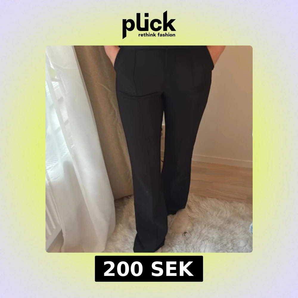 Snygga svarta kostymbyxor med bootcut-snitt och hög midja. Byxorna har en klassisk look med pressveck och sitter riktigt bra över höfterna. Perfekta för dig som gillar en stilren och trendig vibe.