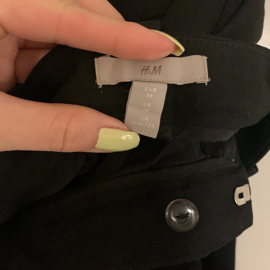 Klassiska kostymbyxor från hm, deras klassiska variant. Medelhög midja, raka. Storlek S (38). Jag har M i byxor så de sitter lite för tight på mig. Annars jättefina.