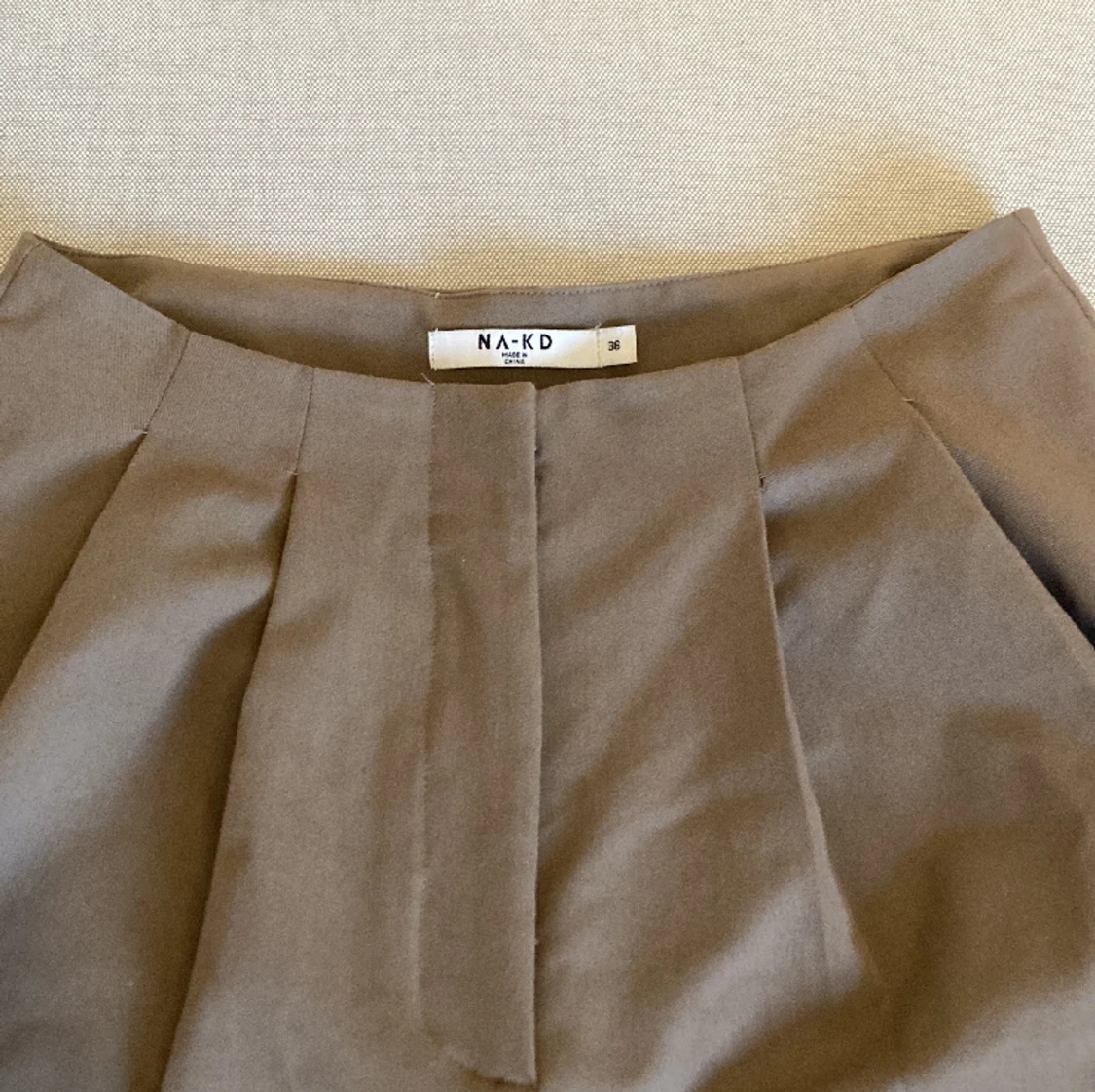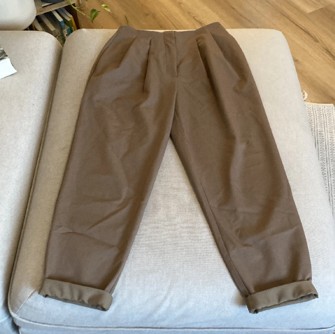 Bruna kostymbyxor från nakd med veckas midja. Större i benen upptill och smalnar av nedåt. Inga synliga defekter, använda sparsamt