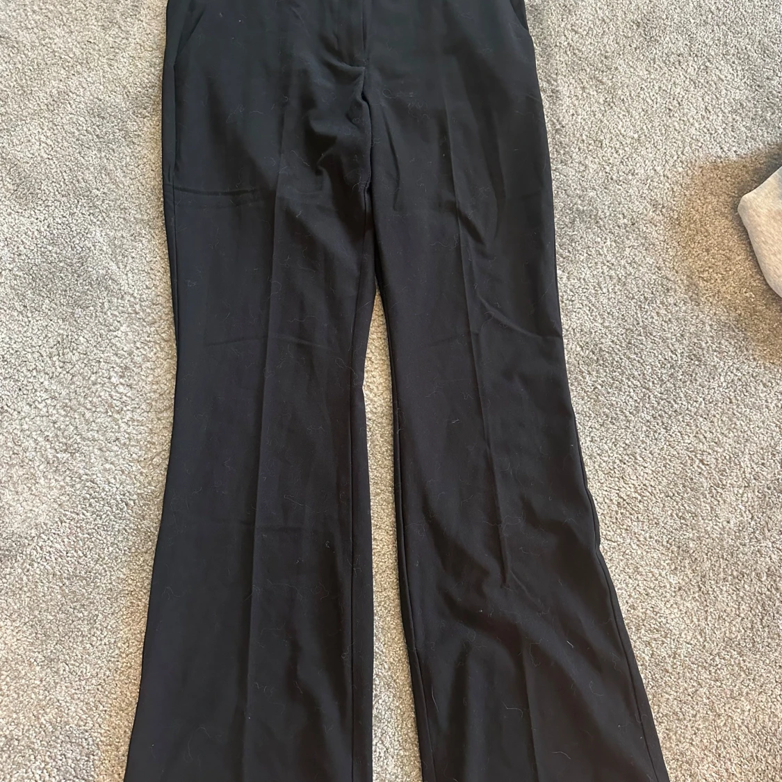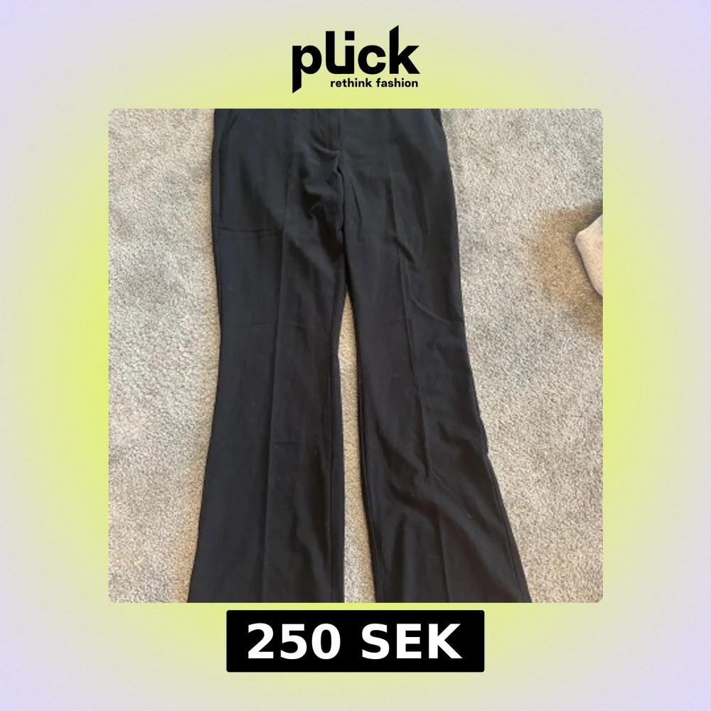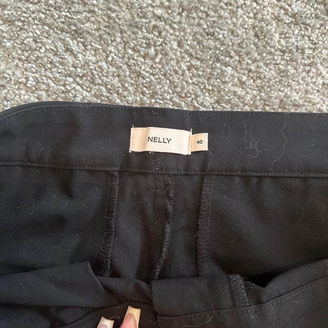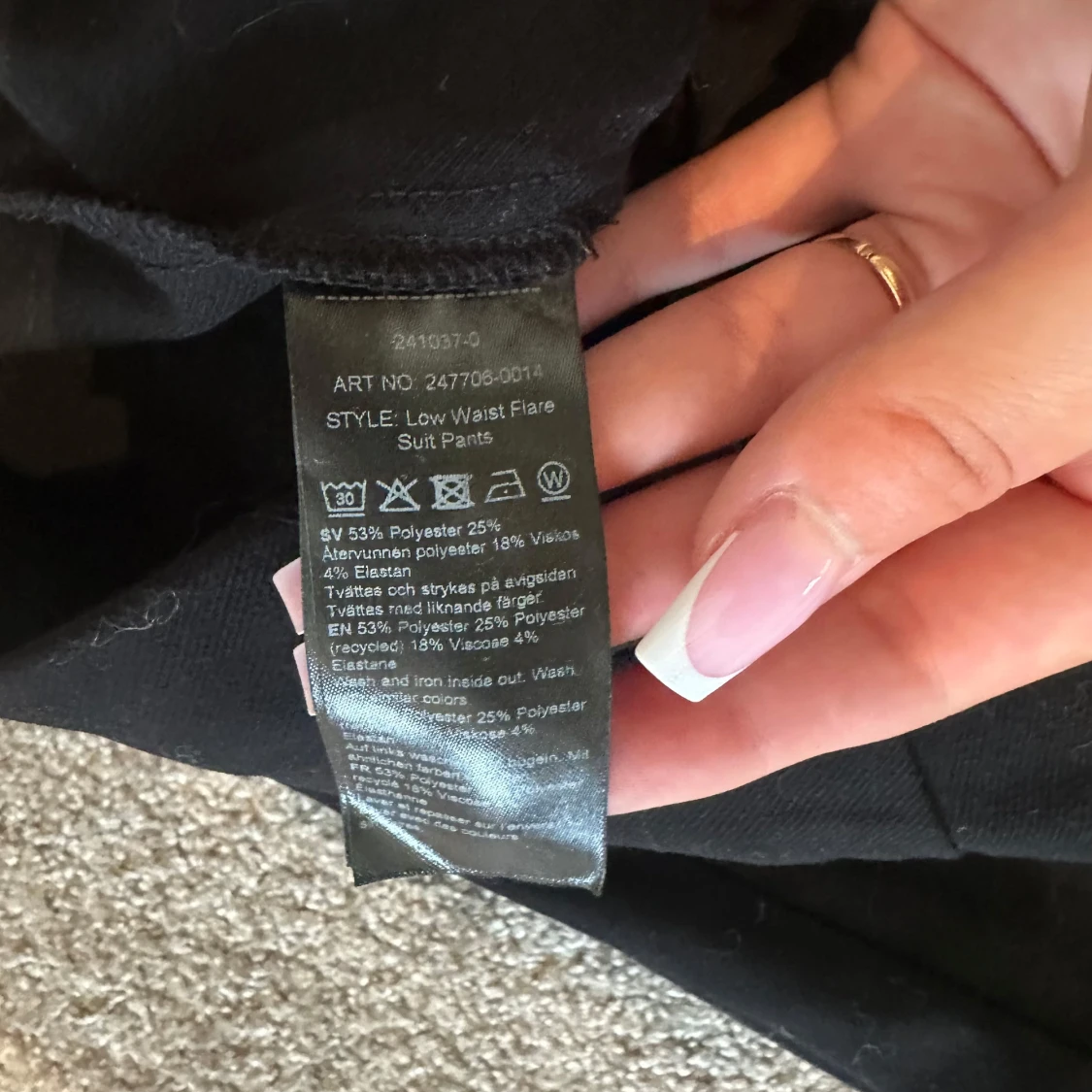 Svarta kostymbyxor från Nelly i low waist-modell med utsvängda ben. Byxorna är gjorda i en mjuk mix av polyester, viskos och elastan som ger en skön passform. Perfekta för en clean och trendig look. Använda max tre gånger så som nya i skicket.