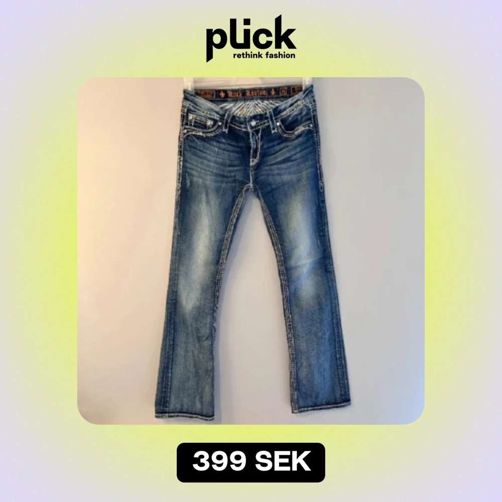 Rock Revival bootcut jeans. Vita designstygn både fram och bak med kristallnitar. Bra skick på tyget men lite nitar som lossnat och framknappen har en spricka (enligt bilderna). Nypris: Rock Revival bootcut ca 1900kr. Hör gärna av dig om du har frågo