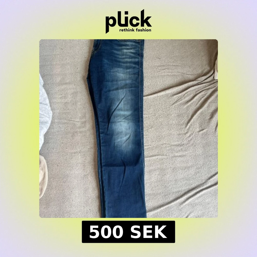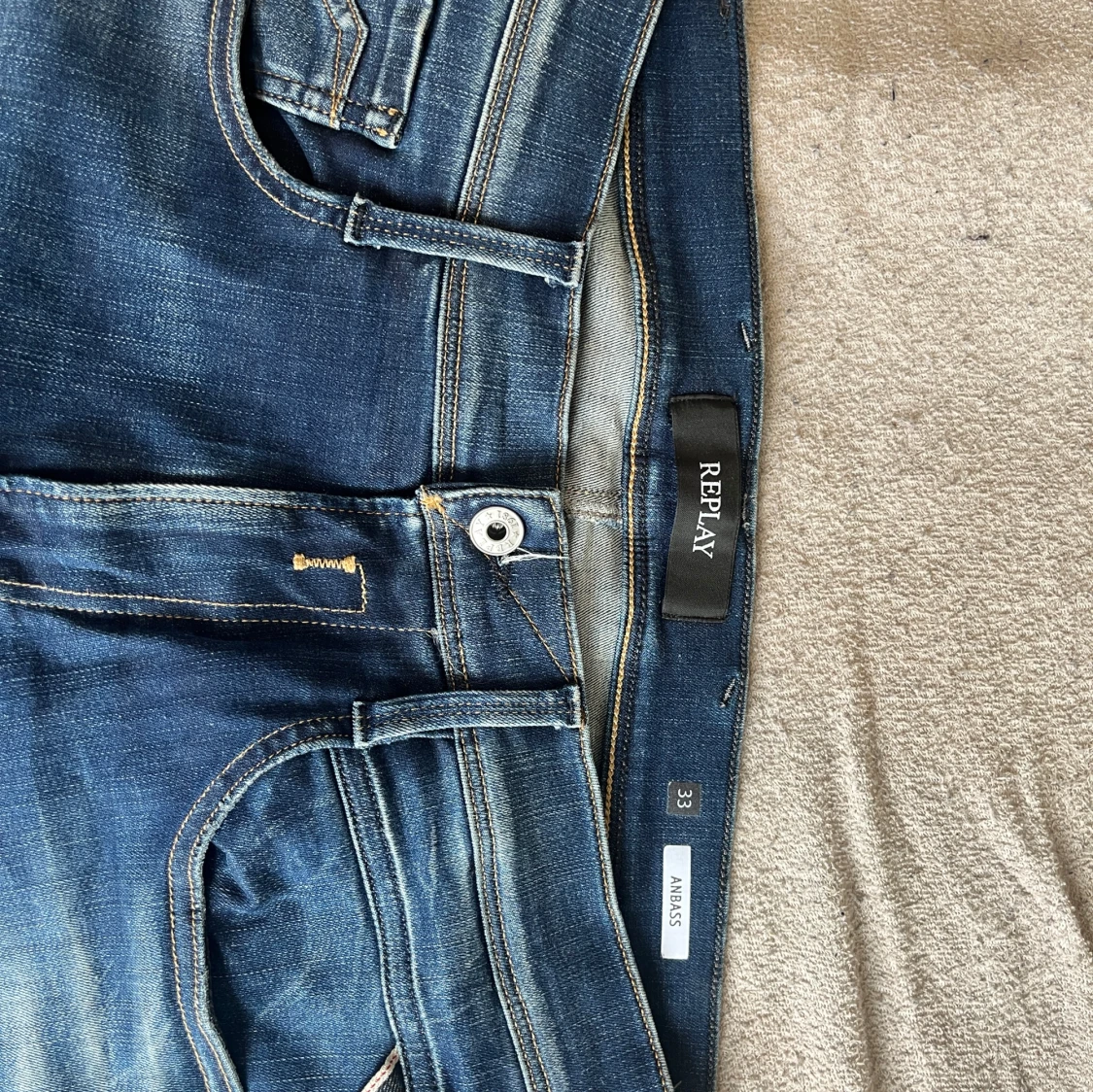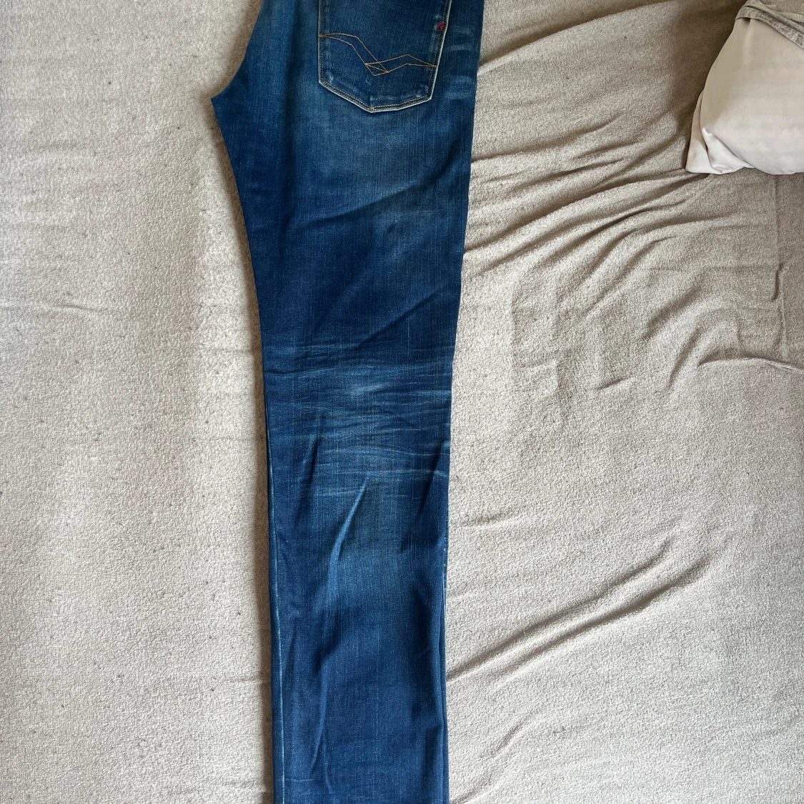 Säljer ett par blå jeansbyxor från Replay med klassisk femficksdesign och snygga slitningar framtill. Byxorna har raka ben och normal passform, samt detaljerade sömmar på bakfickan.