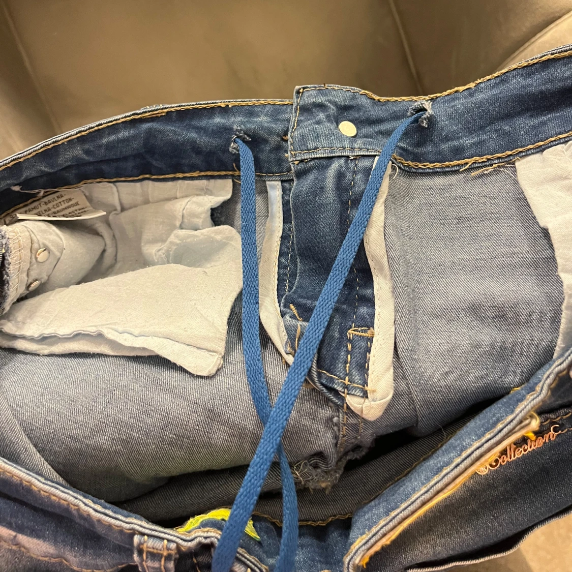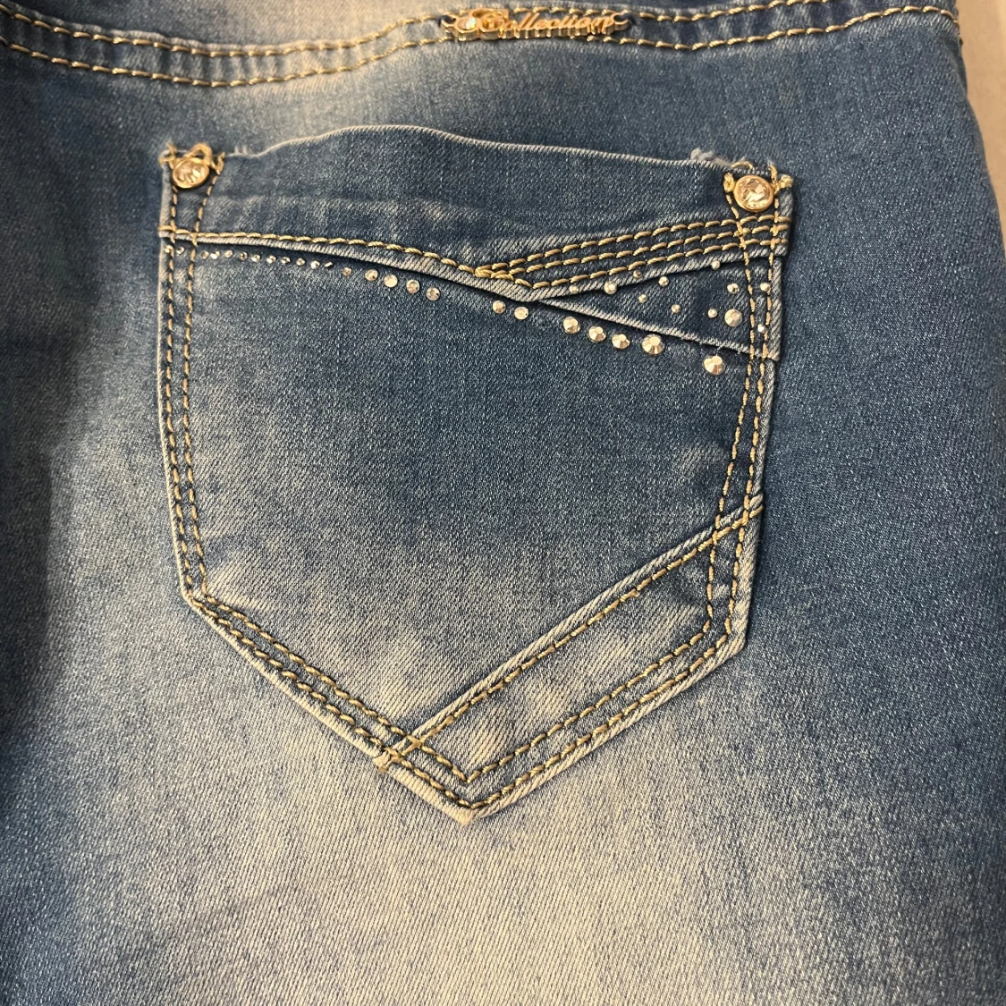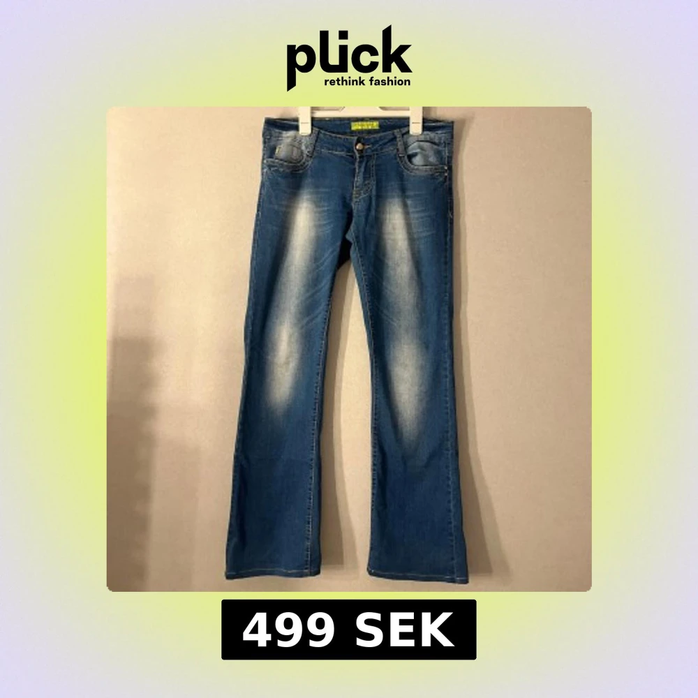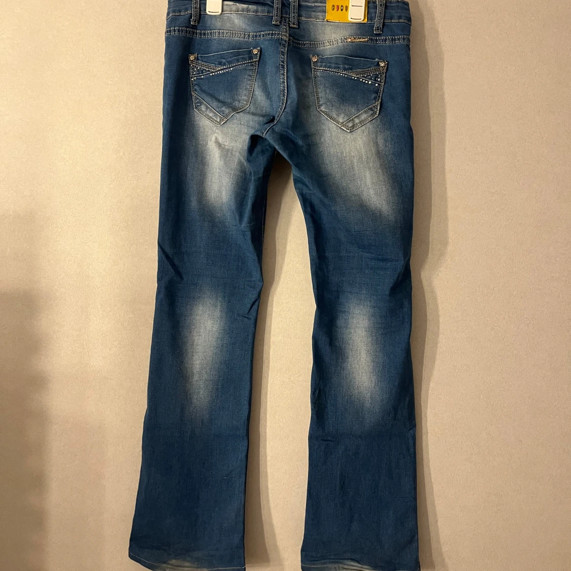 Snygga blå bootcut jeans från Miss Curry med ljusa partier framtill och baktill. Jeansen har dekorativa nitar på bakfickorna och guldig knapp framtill. Klassisk femficksmodell i stretchig denim med kontrastsömmar. Har lagt in ett snöre inne i byxorna då den va lite för stora för mig i midjan men verkligen inget som syns när den sitter på, går att ta ut den om man inte vill ha den kvar. E verkligen jätte jätte Lågmidjade vid frågor elr mer bilder e de bara att kontakta mig🤗