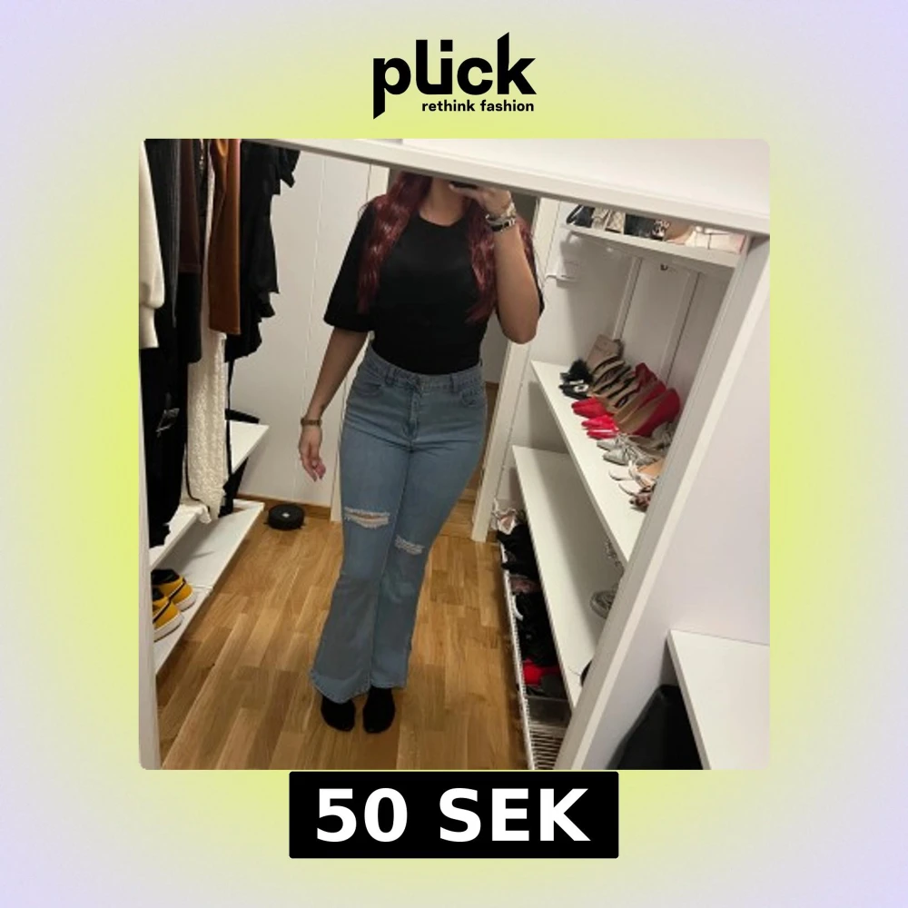 Snygga ljusblå bootcut jeans med hög midja och slitna detaljer på låret. Jeansen har klassisk femficksdesign och är tillverkade i denim med lite stretch för skön passform. Perfekta för dig som gillar en trendig och avslappnad look.