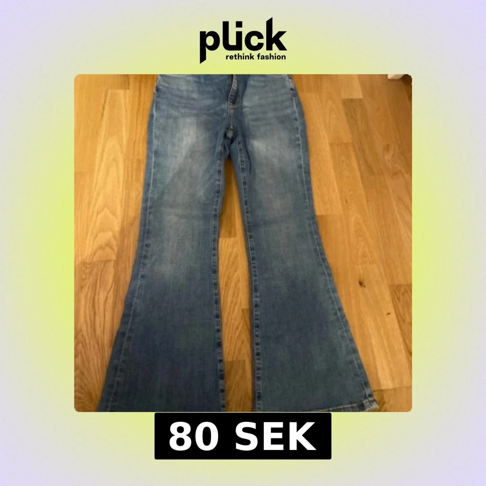 Blåa Peachy Flare jeans från Never Denim by Bik Bok. Modellen har utsvängda ben och klassisk femficksdesign. Jeansen är tillverkade i en blandning av bomull, polyester, viskos och elastan för en bekväm passform.