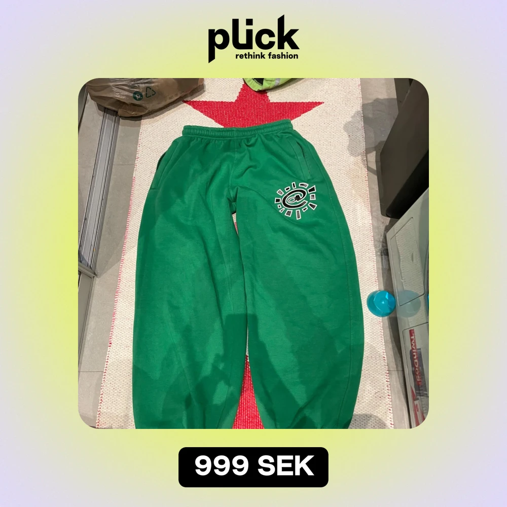 Säljer ett par gröna mjukisbyxor i storlek L. De har ett coolt tryck på ena benet och en praktisk dragkedja på fickan. Perfekta för en avslappnad dag hemma eller en promenad i parken. Superbekväma och stiliga! 💚