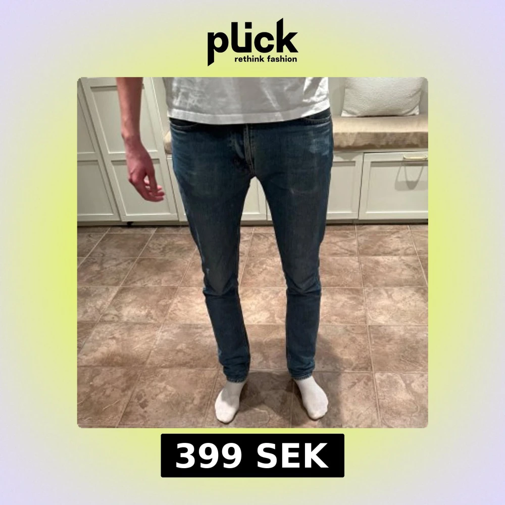 Säljer ett par blå jeans med tight passform och slitna detaljer på bakfickan. Perfekta för en avslappnad stil. Midjan är normal och byxorna har en klassisk femficksdesign.