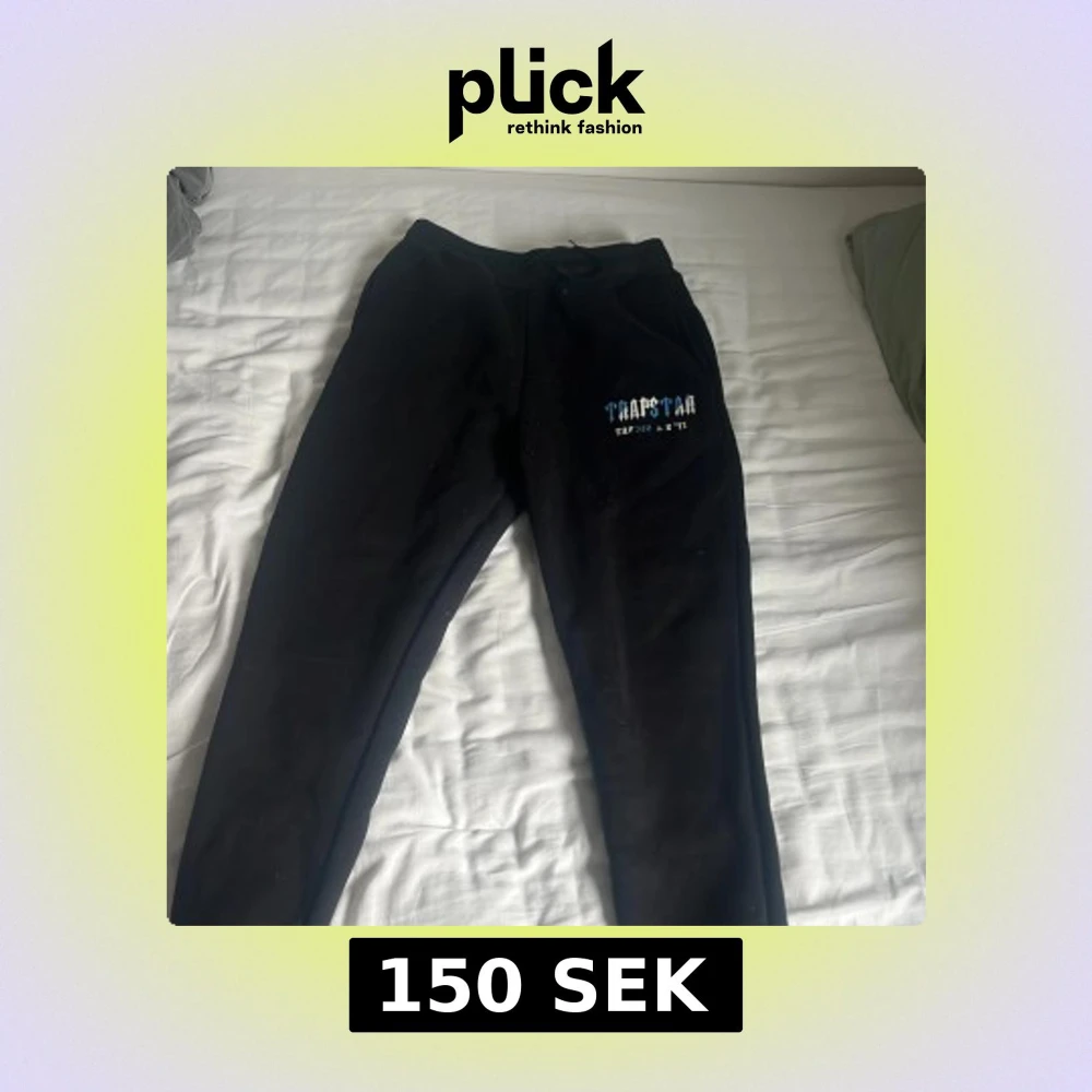 Svarta mjukisbyxor från Trapstar med tryck i blått och vitt på ena benet där det står 'Trapstar It’s a secret'. Byxorna har en avslappnad passform och resår i midjan.