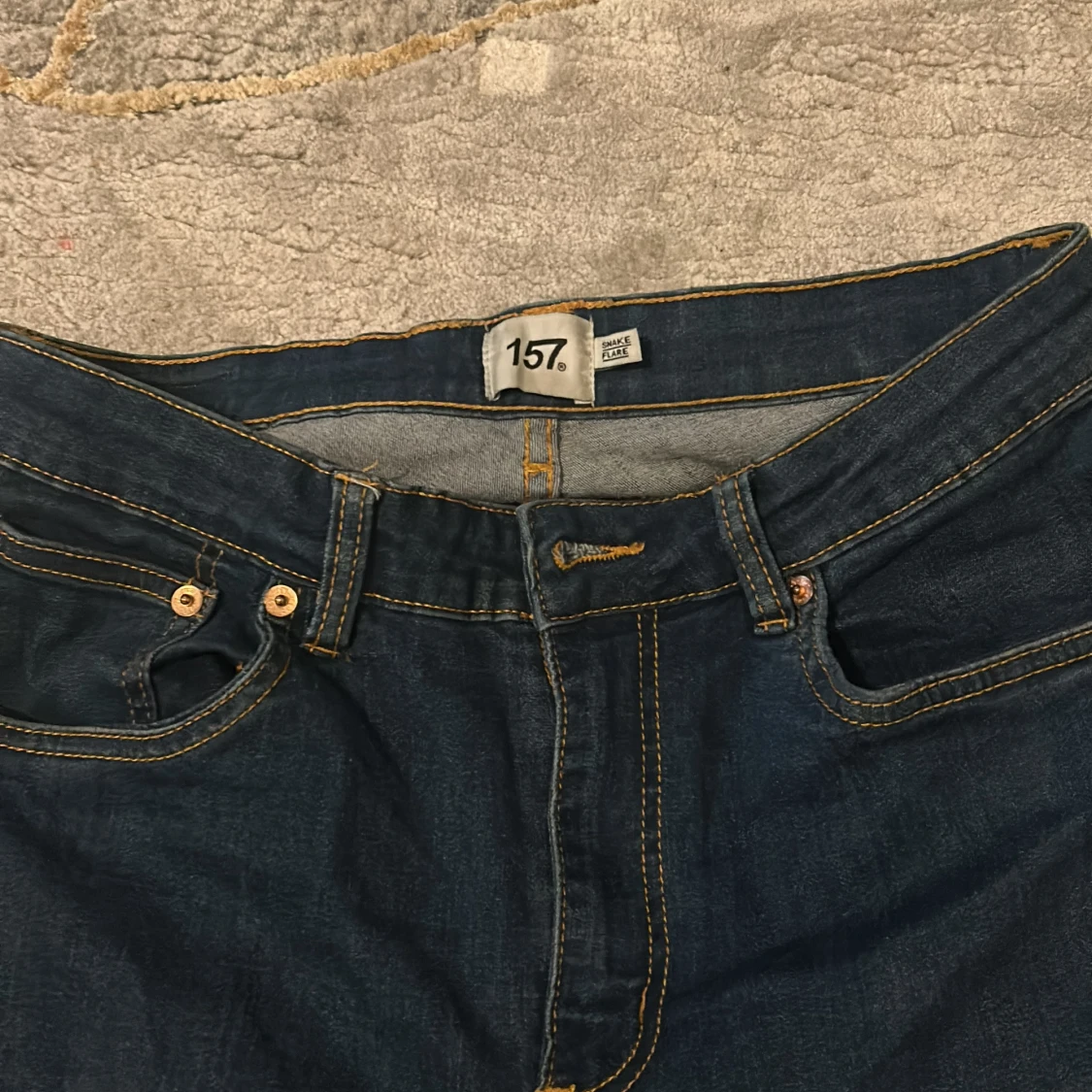 Snygga mörkblå jeans från 157 med klassisk bootcut-modell och kontrastsömmar. Jeansen har fem fickor, normal passform och är tillverkade i ett mjukt denimtyg. Perfekta för dig som gillar retrovibbar och vill ha ett par jeans med lite vidare ben.