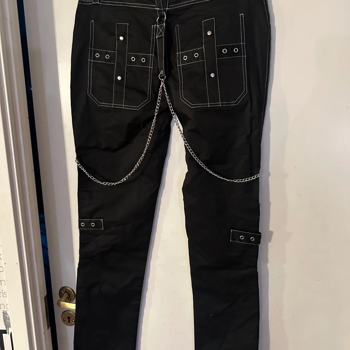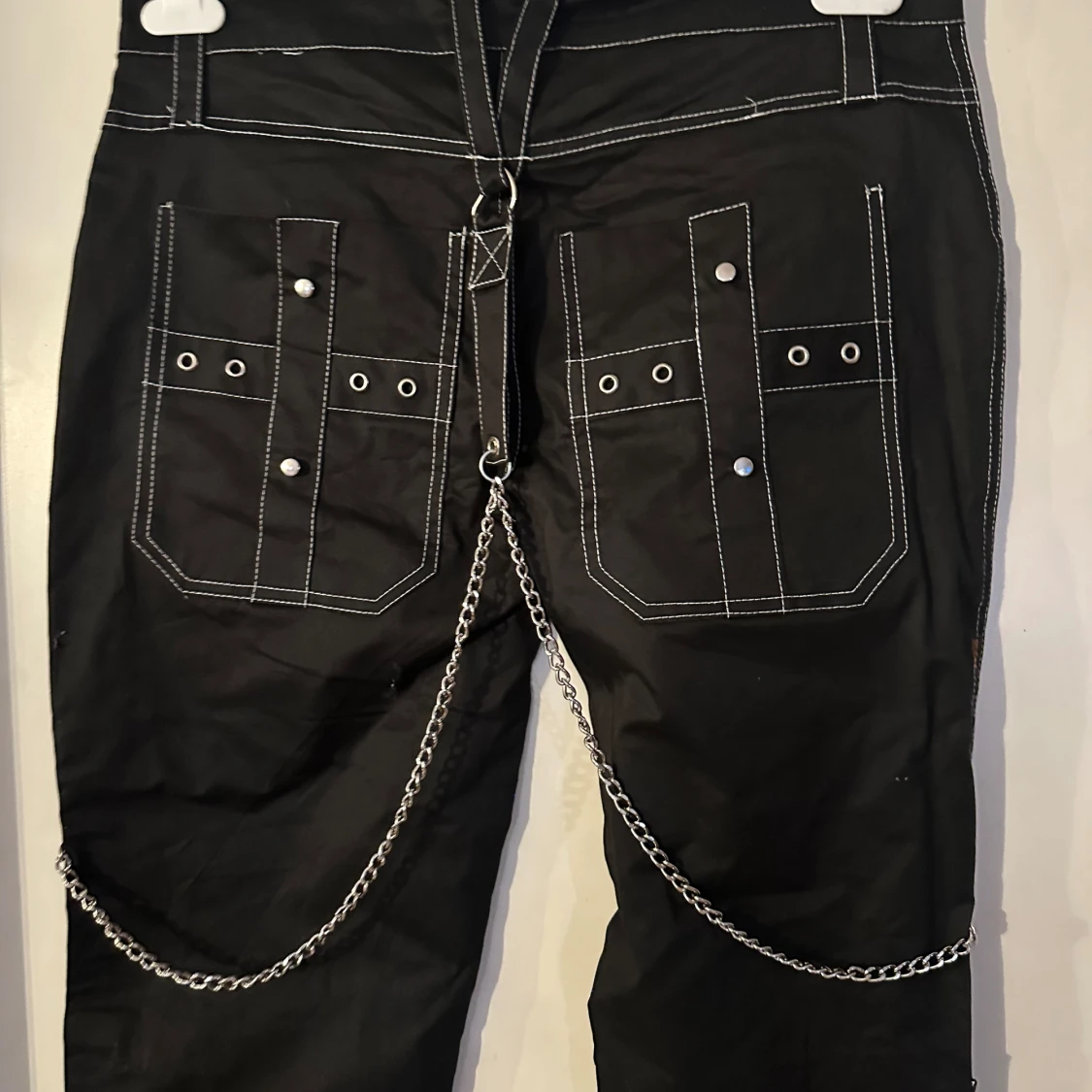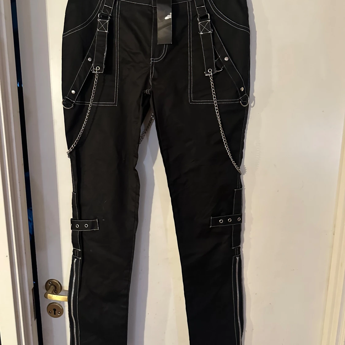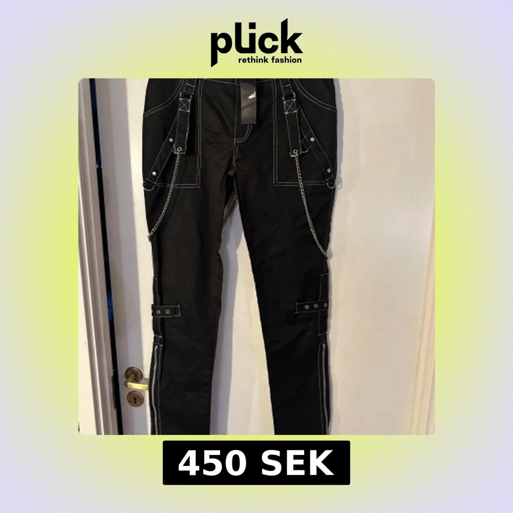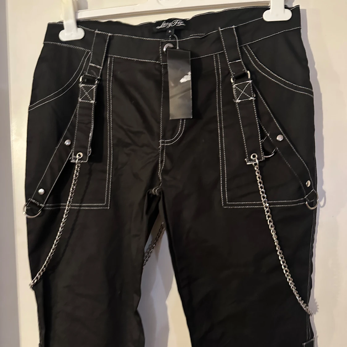 Helt ny lite rockigare byxa från Lucyfer. Storlek L, men tycker den är som M/L. Material i skön bomullstretch. Midjevidd 85,5 cm. Stussvidd ca 98 cm.