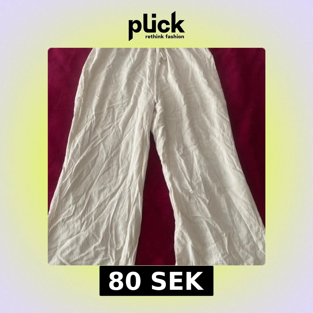 Säljer ett par beiga linnebyxor med breda ben och elastisk midja med knytband. Byxorna har en avslappnad passform och är perfekta för varma dagar. Lätta och luftiga, passar till många olika stilar.