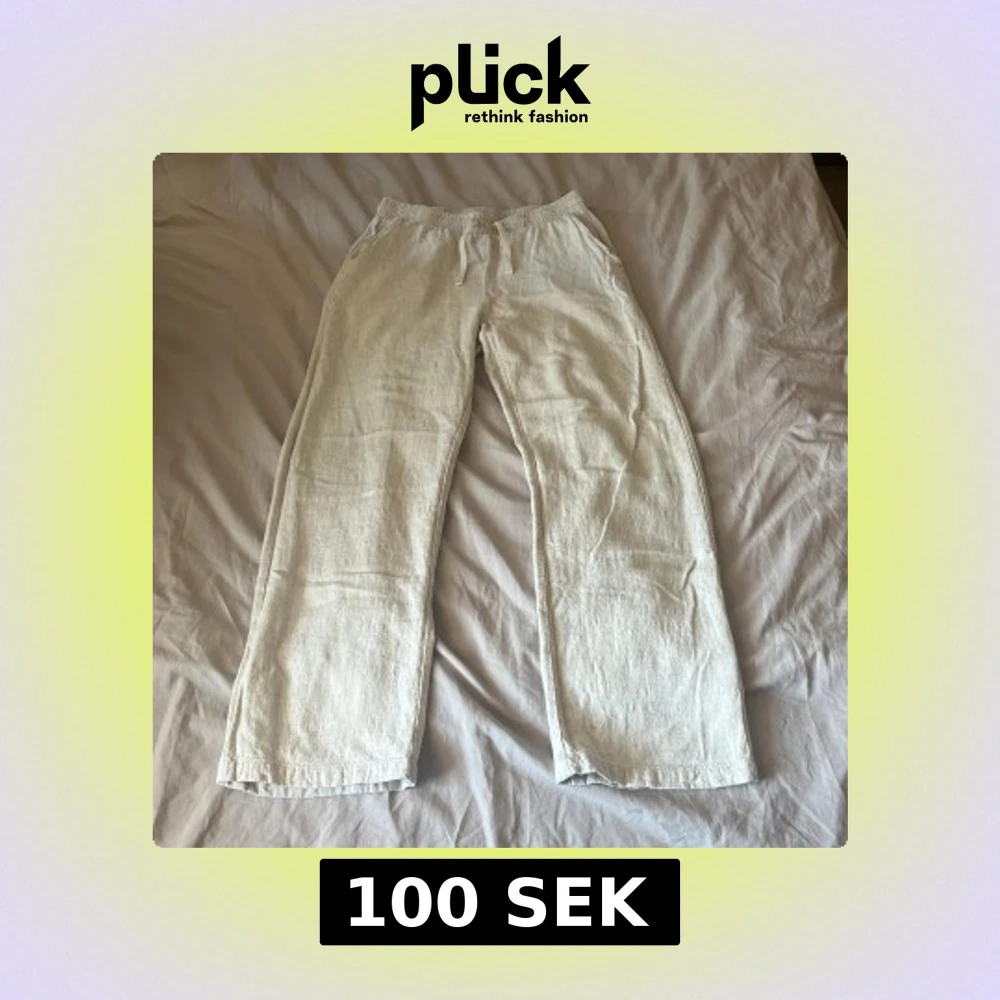 Har ett par linnebyxor som typ aldrig har använts från kids brand store, det står L i barn men skulle säga att det känns mer som en typ S. Midjan är 35 cm fast det är resår, innerbenslängd är 71 cm