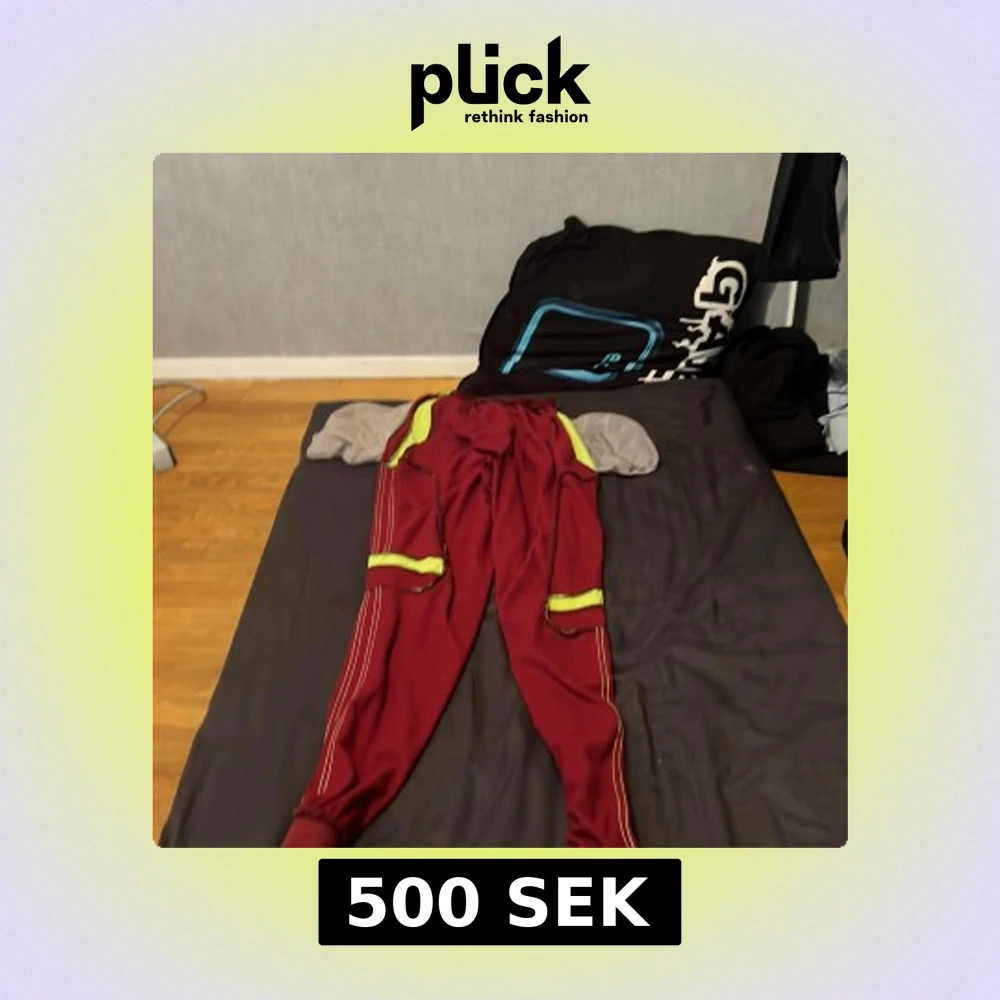 Säljer ett par vinröda mjukisbyxor med gula detaljer och vita sömmar längs benen. Byxorna har resår i bensluten och ser riktigt sportiga ut, perfekta för chill eller träning. Materialet känns mjukt och bekvämt.