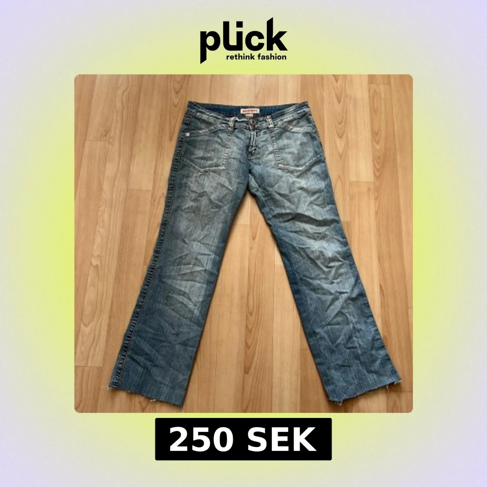 Säljer ett par klassiska blå jeans med bootcut passform och rå, ofållad kant nertill. Jeansen har fem fickor, dragkedja och knapp framtill samt ljusa slitningar för en avslappnad look.