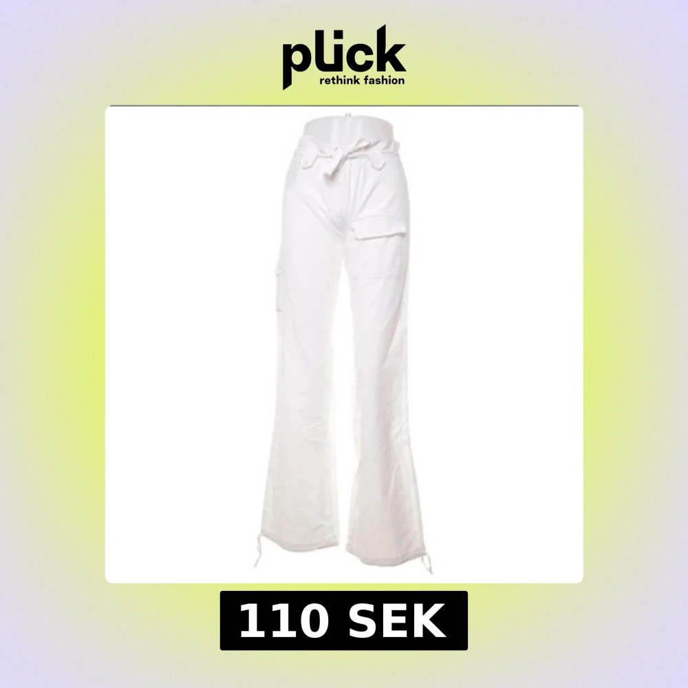 Snygga vita cargopants från Shout i storlek L, men sitter bättre på någon som har M då de är lite mindre i storleken tillverkade i 100% bomull. Byxorna har hög midja med knytband, breda ben och praktiska fickor på sidorna. Detaljer som snörning vid benslut och en cool utility-look gör dem perfekta för en trendig streetstyle.