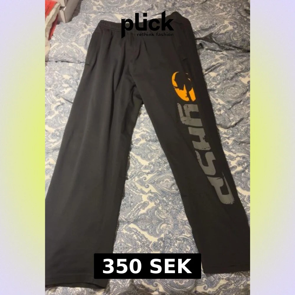 Svarta träningsbyxor från GASP i storlek L med elastisk midja och stort tryck i grått och orange längs ena benet. Byxorna har en loose passform och är gjorda i mjukt syntetmaterial, perfekta för gymmet eller chill hemma.