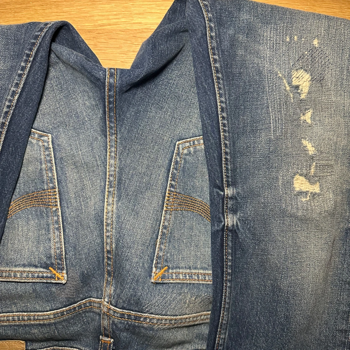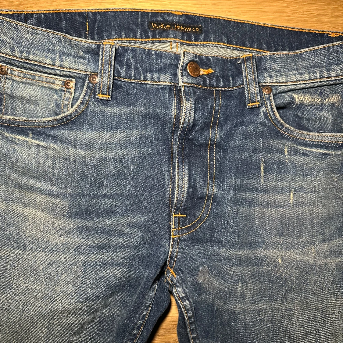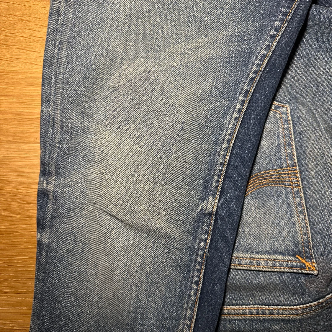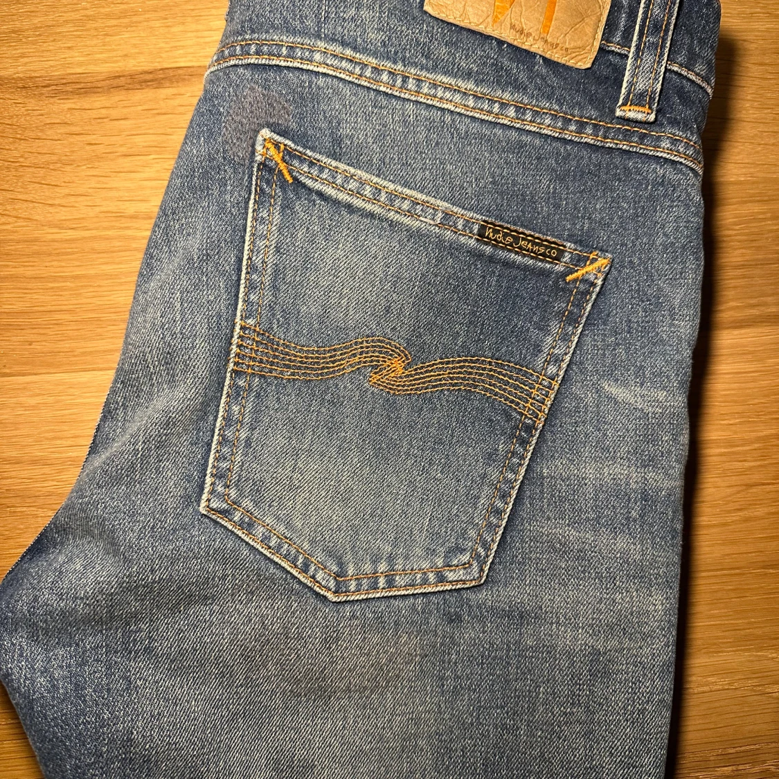 Säljer ett par klassiska blå jeans från Nudie Jeans med snygga slitningar och kontrastsömmar. De har en normal passform och är perfekta för en avslappnad stil. Modellen är lean dean och sitter något större än vanliga jeans