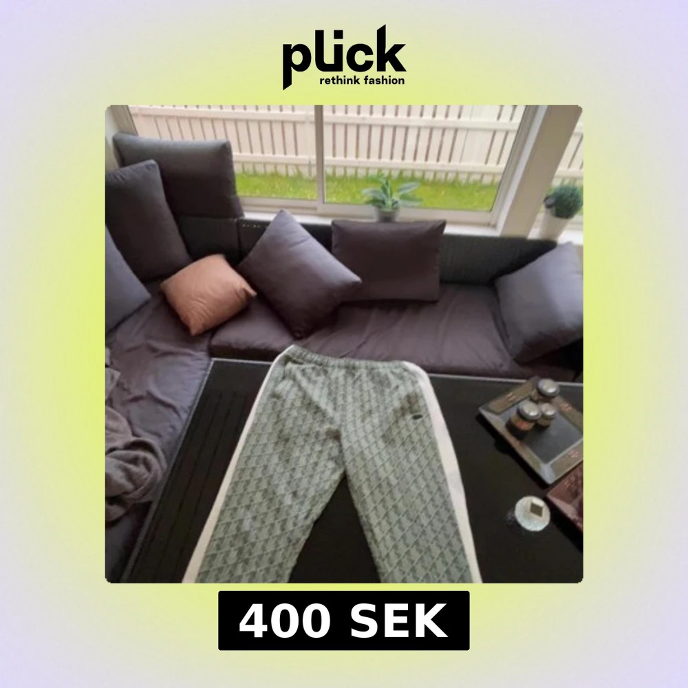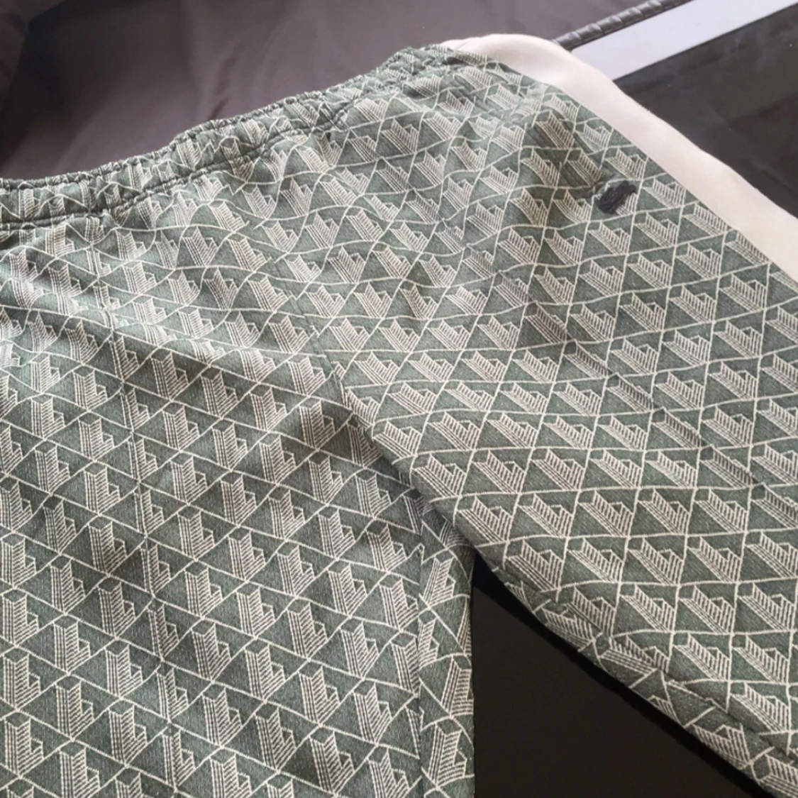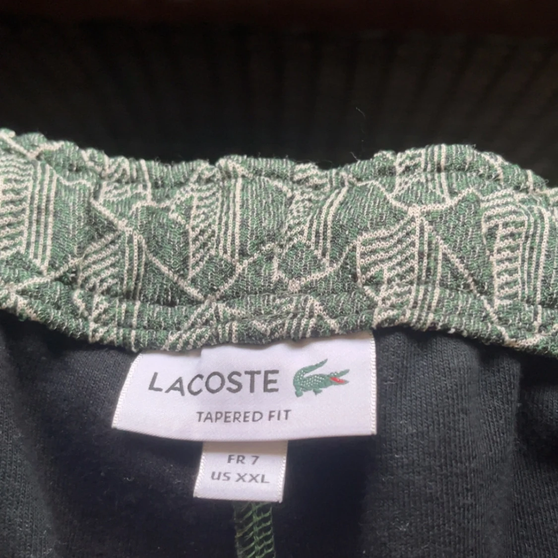 Säljer ett par gröna byxor från Lacoste i storlek XXL med vitt geometriskt mönster och vita sidor. Byxorna har elastisk midja och tapered fit, vilket ger en snygg och modern siluett. Perfekta för dig som gillar streetwear med unik touch.