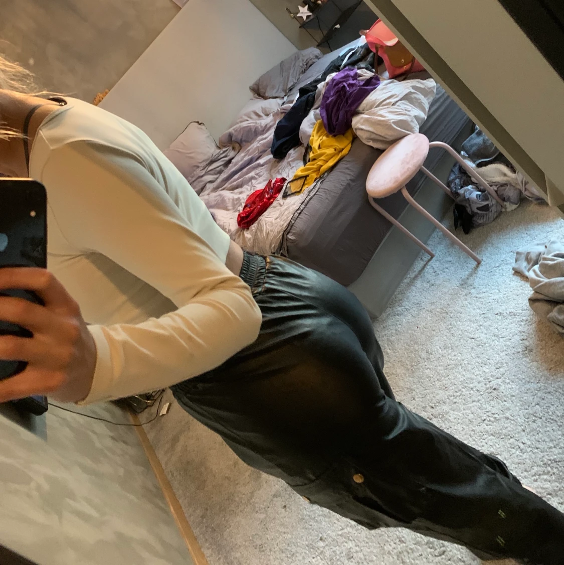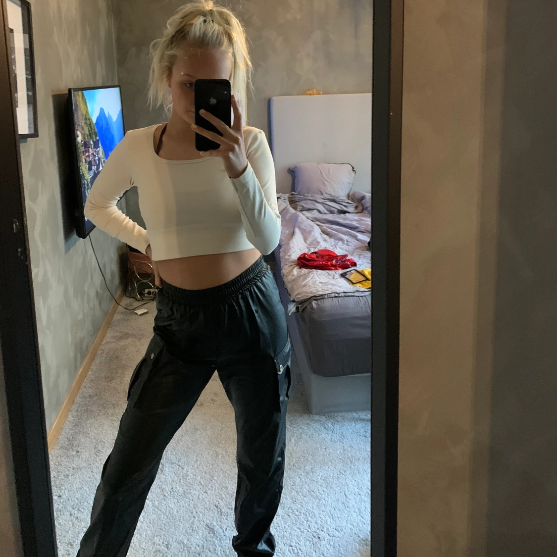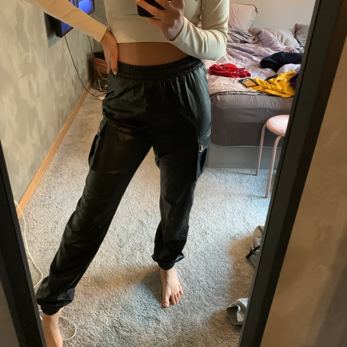 Coola läderbyxor i cargomodell (lite pösigare) från prettylittlething. Knappt använda. Ge bud