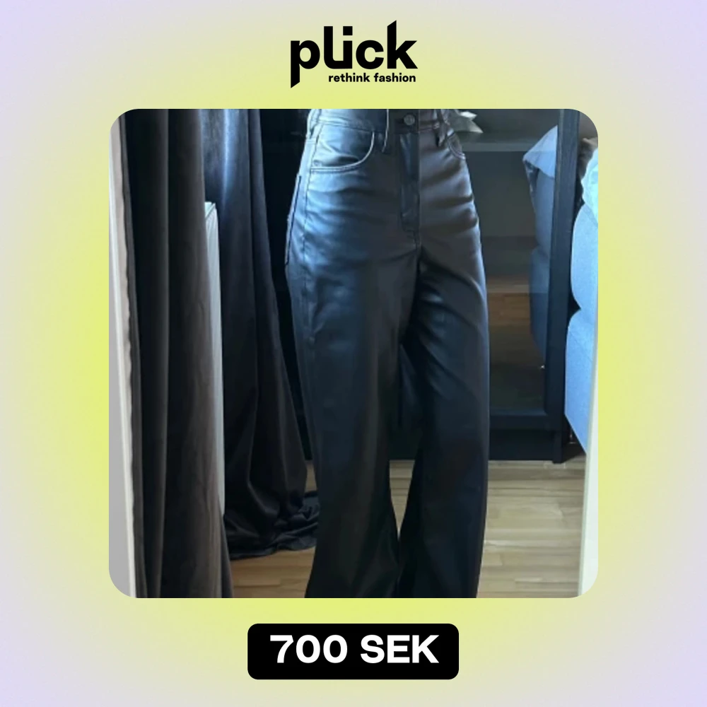 Levis läderbyxor som är high waisted, har ett inre mjukare tyg som gör dem bekväma att bära. Jag är ungefär 152cm och passar någon med liknande längd 💕💕