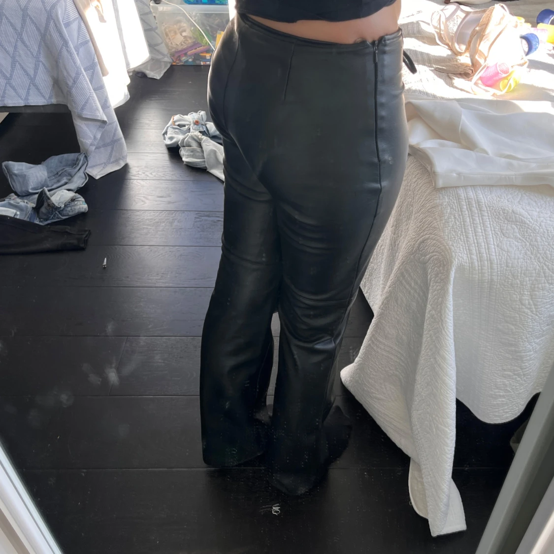 Snygga läder byxor i bootcut. Några små små defekter men syns knappt.