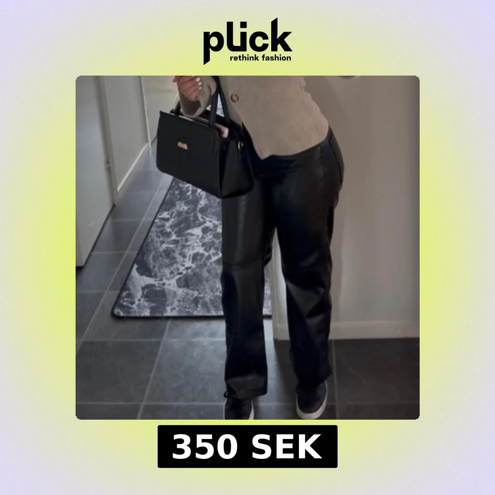 Säljer ett par svarta byxor i skinnimitation med rak och vid passform. Byxorna har medel midja och ger en cool, trendig look. Endast använda en gång