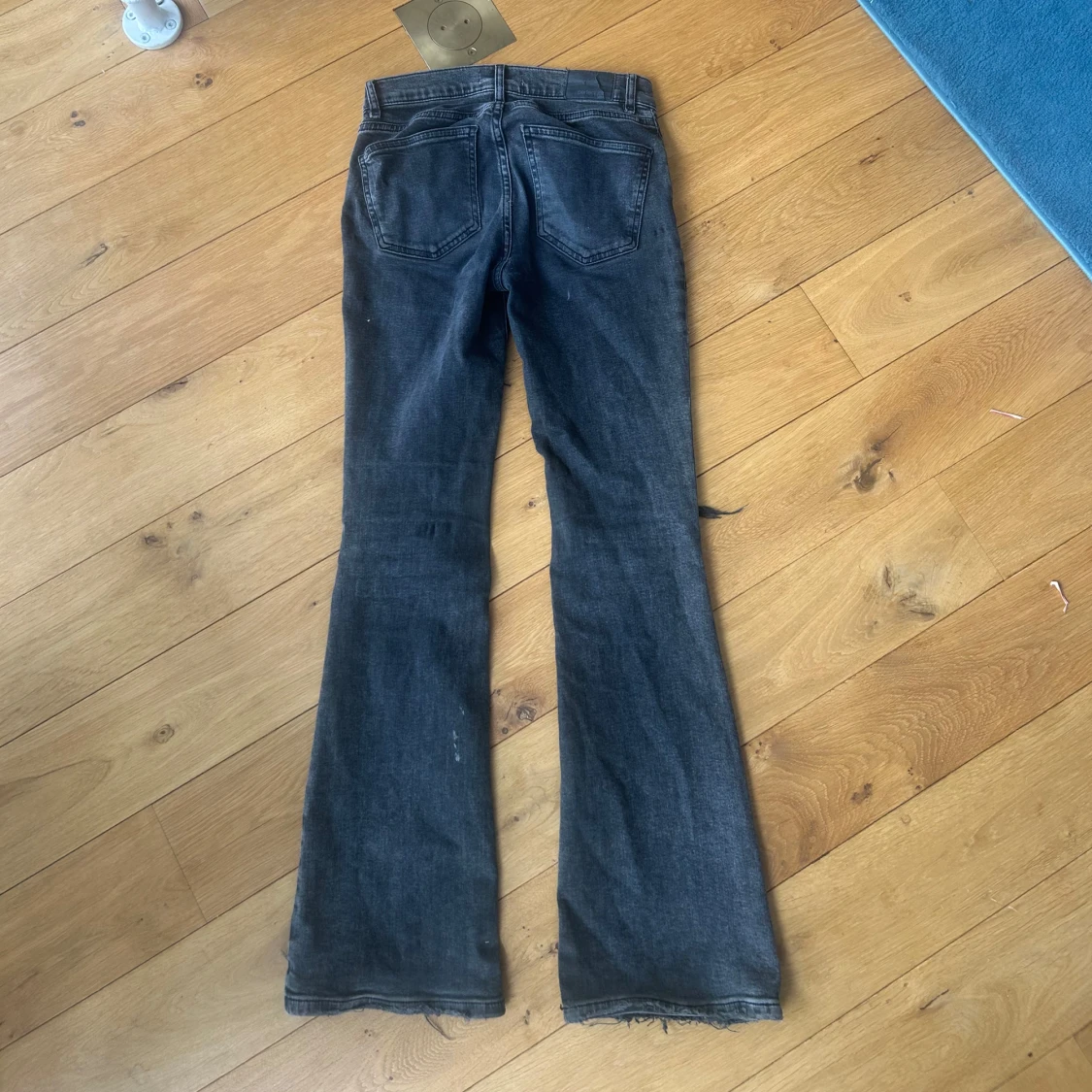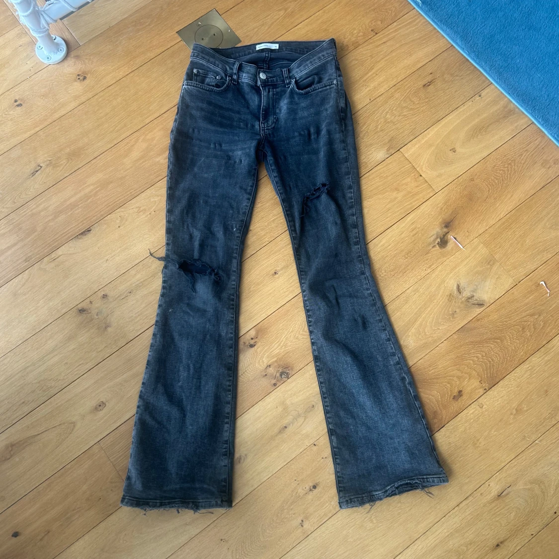 Säljer mina mörkgråa Gina tricot jeans som jag själv har gjort rivor i! De är lågmidjade och med en bootcut 💗Så snygga! Storlek 34/S