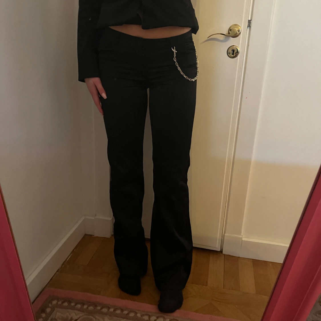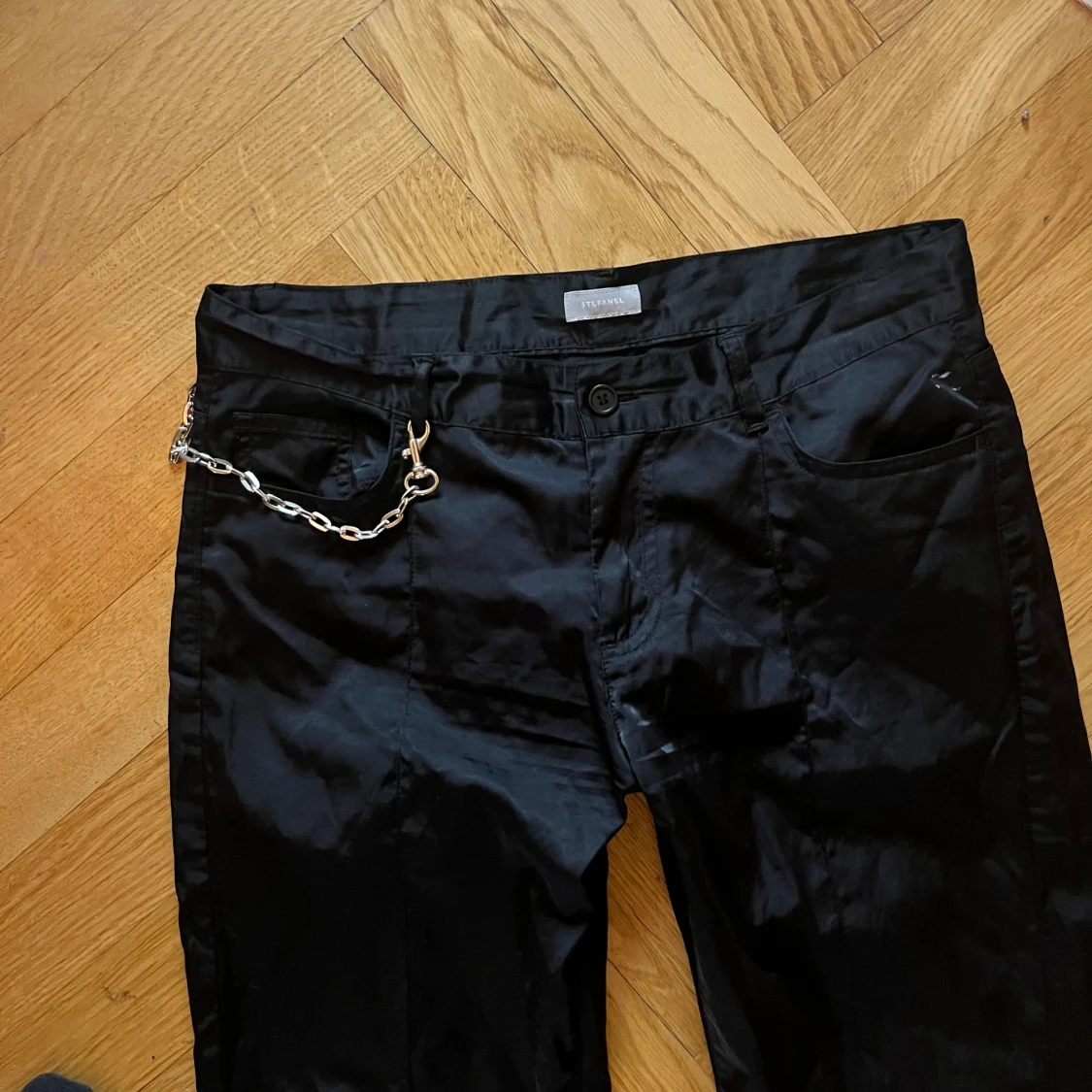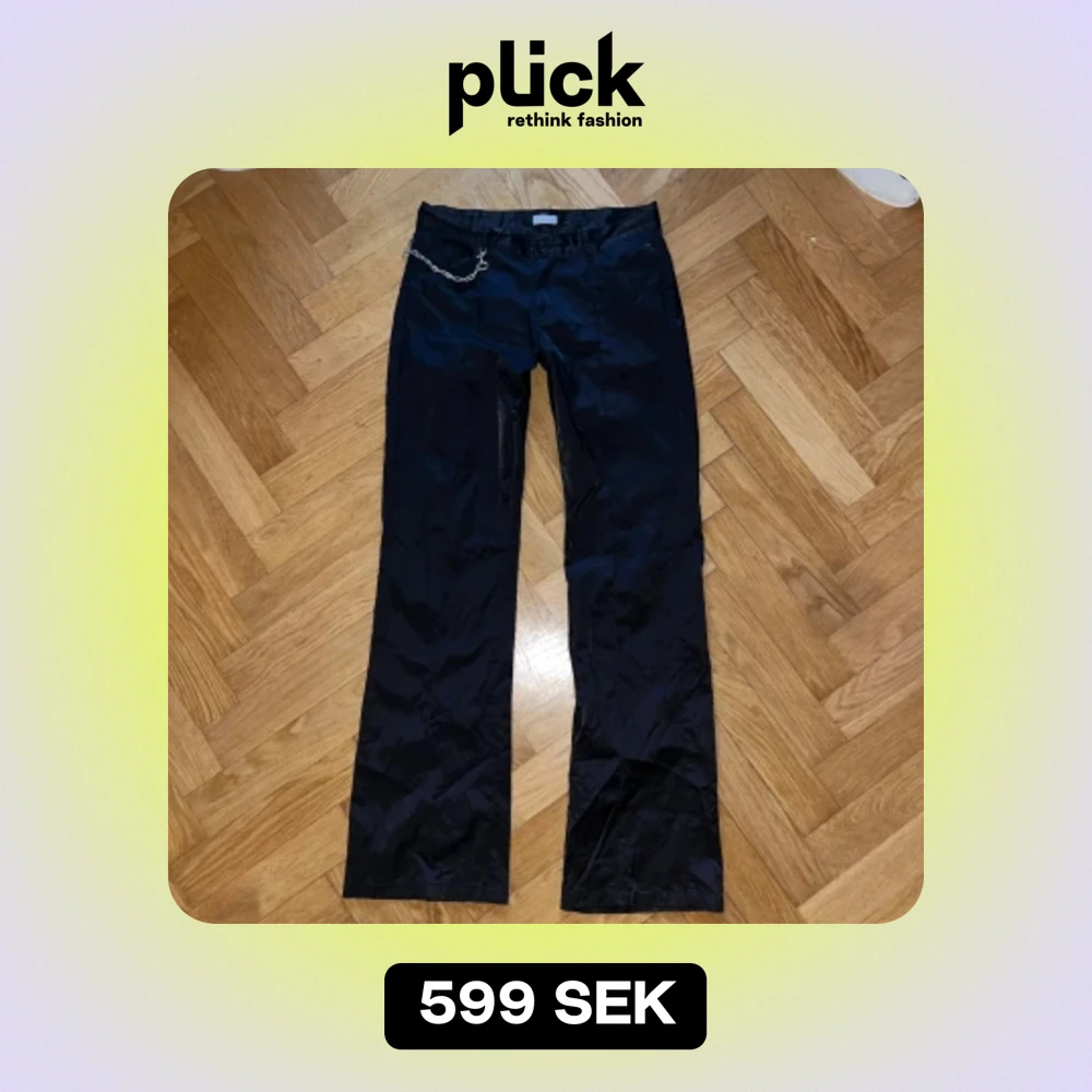 Lågmidjade kostymbyxor med bootcut och glansigt tyg, storlek S