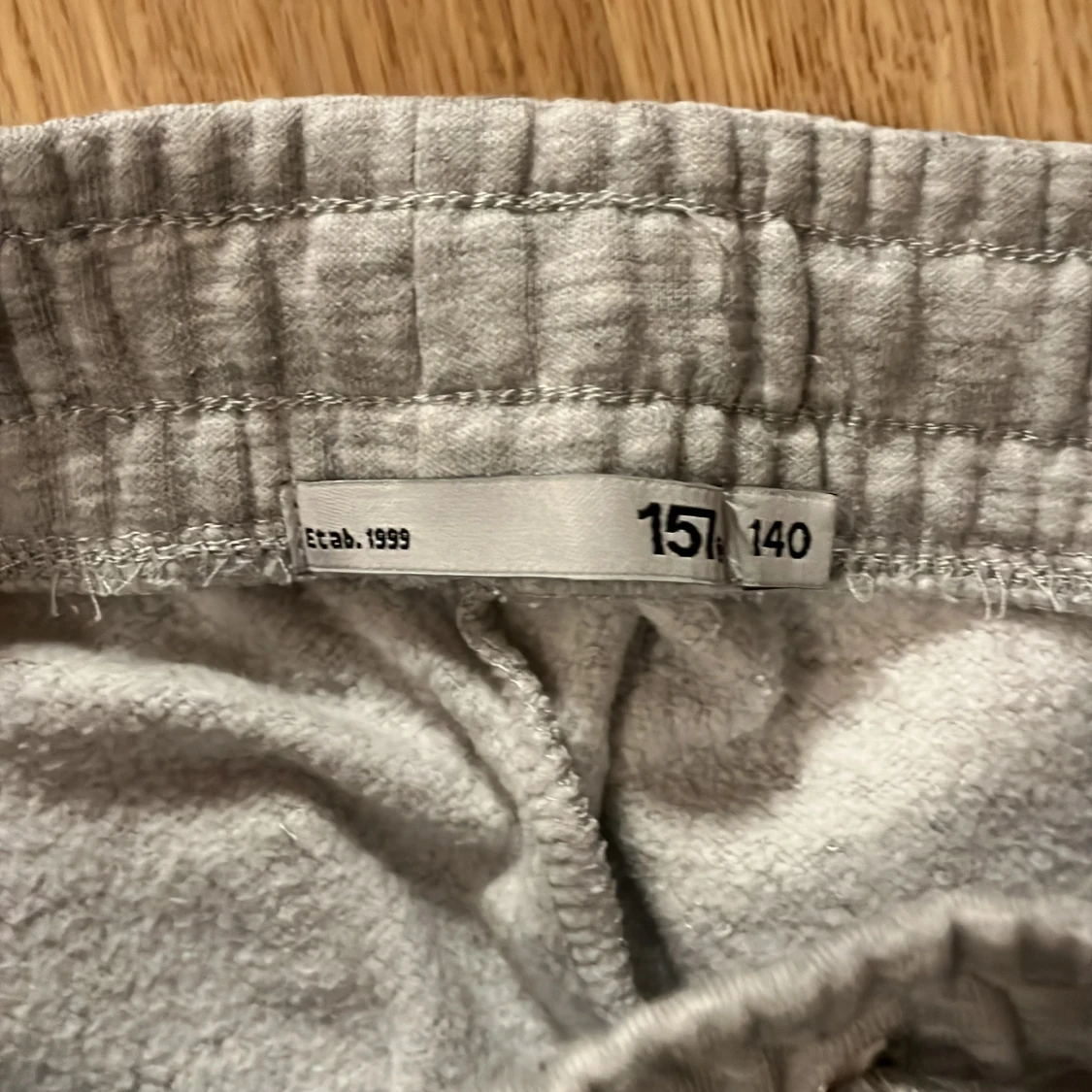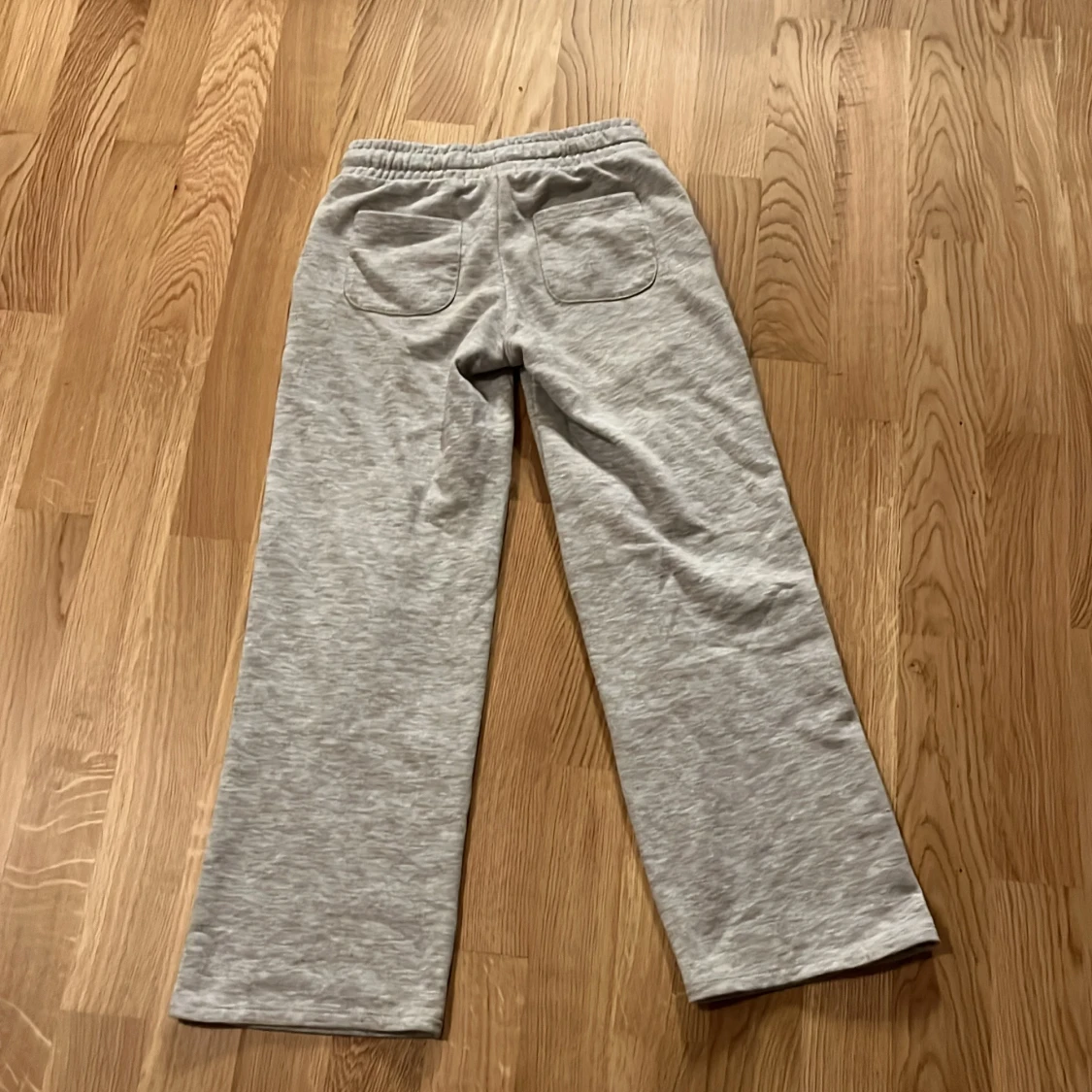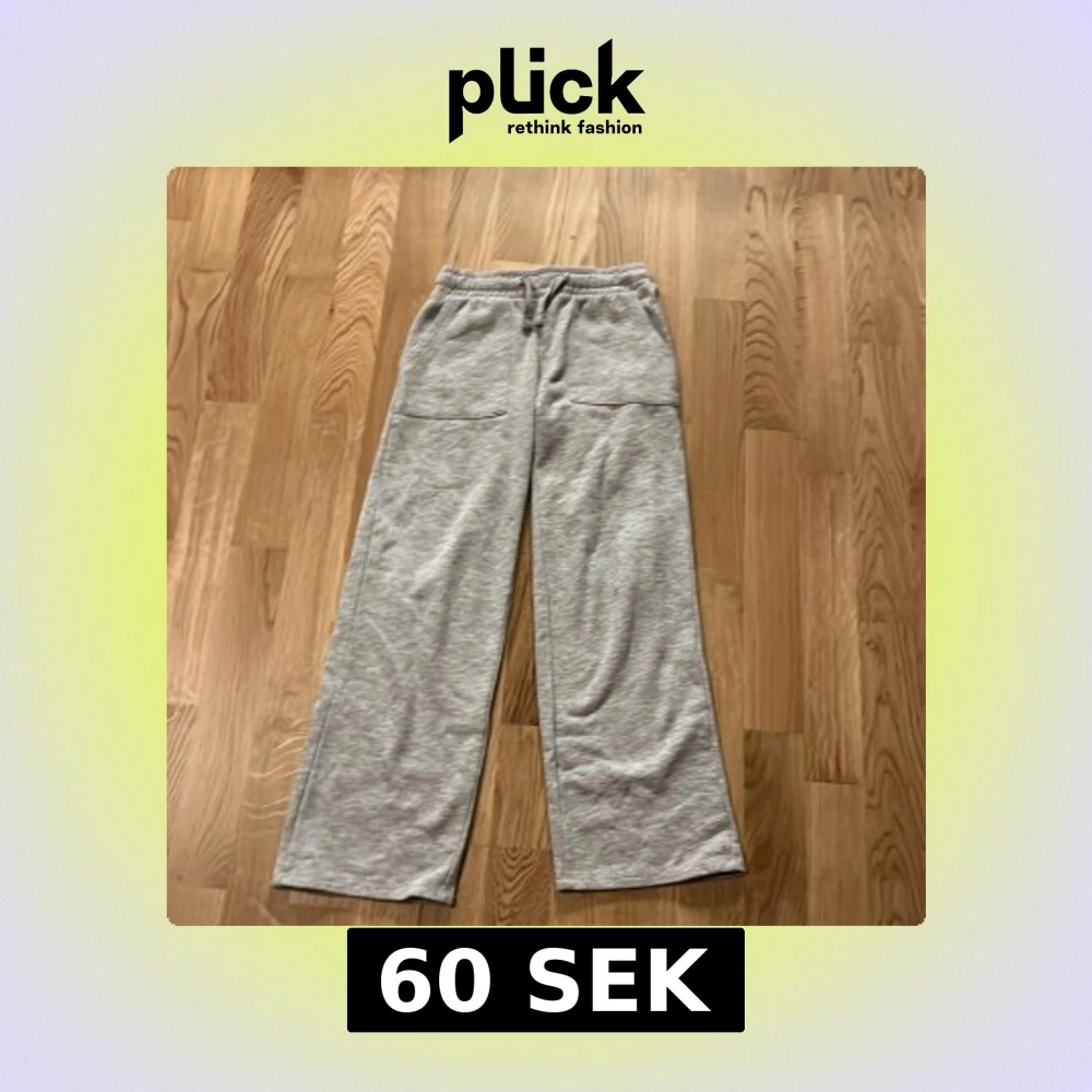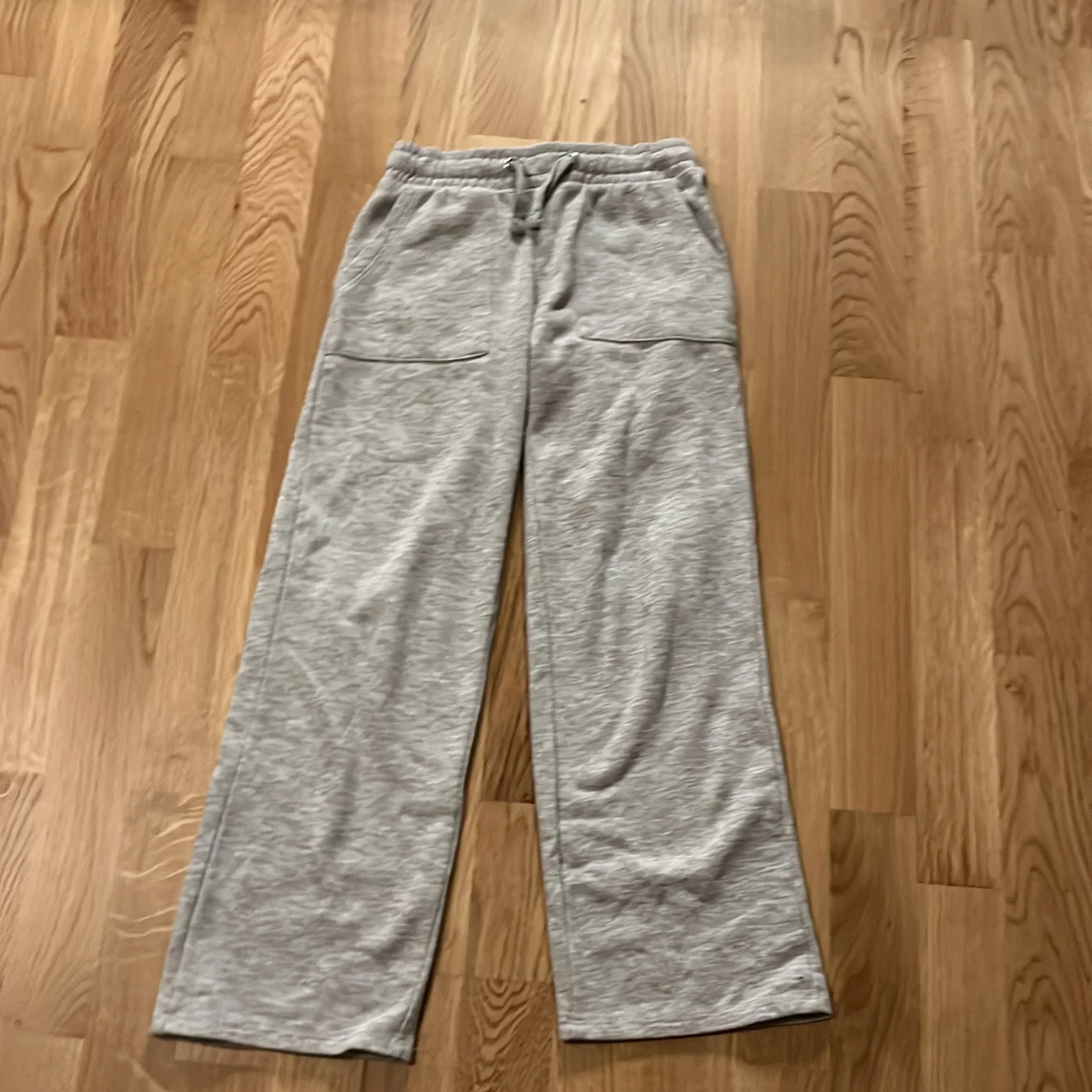Säljer ett par bekväma grå mjukisbyxor med elastisk midja och raka ben. Byxorna har praktiska fickor både fram och bak, perfekta för en avslappnad stil.
