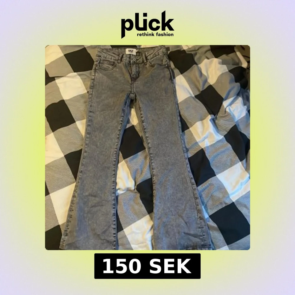 Säljer ett par grå bootcut jeans med klassisk femficksdesign och bälteshällor. Jeansen har en lätt tvättad look och raka ben som blir vidare nedtill. Perfekta för dig som gillar en retrostil.
