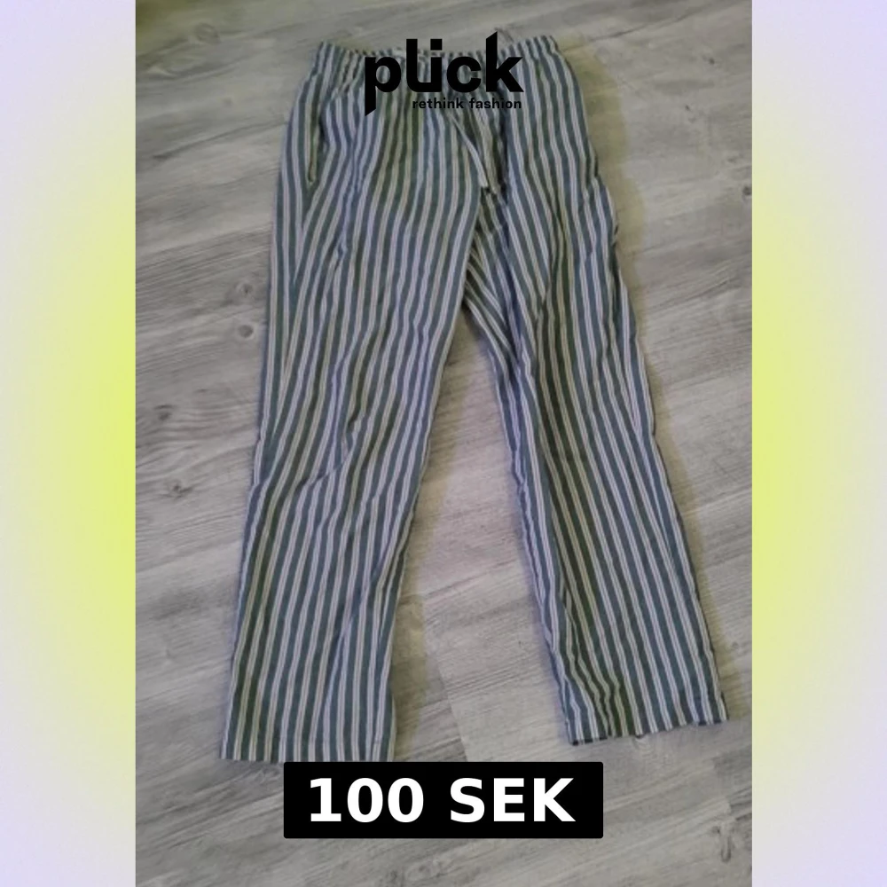 Säljer ett par chill randiga linnebyxor med gröna, blå och vita ränder. Byxorna har elastisk midja med snörning och raka ben för en avslappnad vibe. Perfekta för varma dagar eller softa hemma. Superlätta och luftiga!