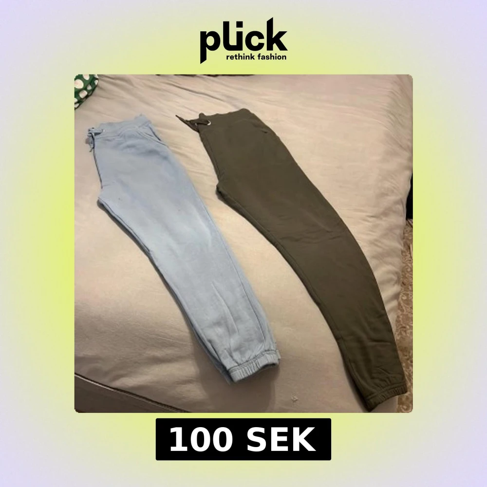 Säljer två par mjukisbyxor från 157 i storlek 160. Ena paret är ljusblått och det andra är khakigrönt. Båda har resår och snörning i midjan. Båda för 100