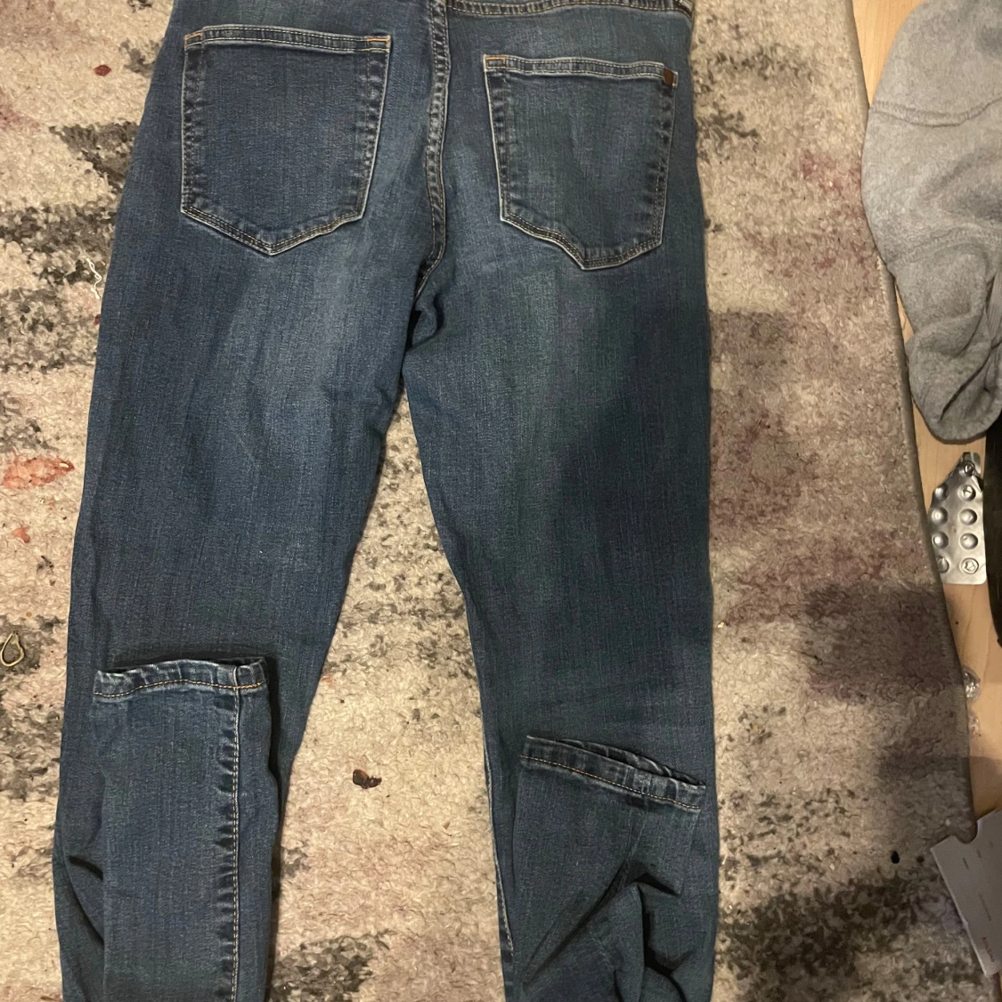 Säljer ett par blå cargopants i jeansmaterial med klassiska fickor på benen och bakfickor. Byxorna har en rak passform och normal midja, perfekta för dig som gillar en avslappnad streetstil. Snygga detaljer med sömmar och slitningar som ger en cool vibe.