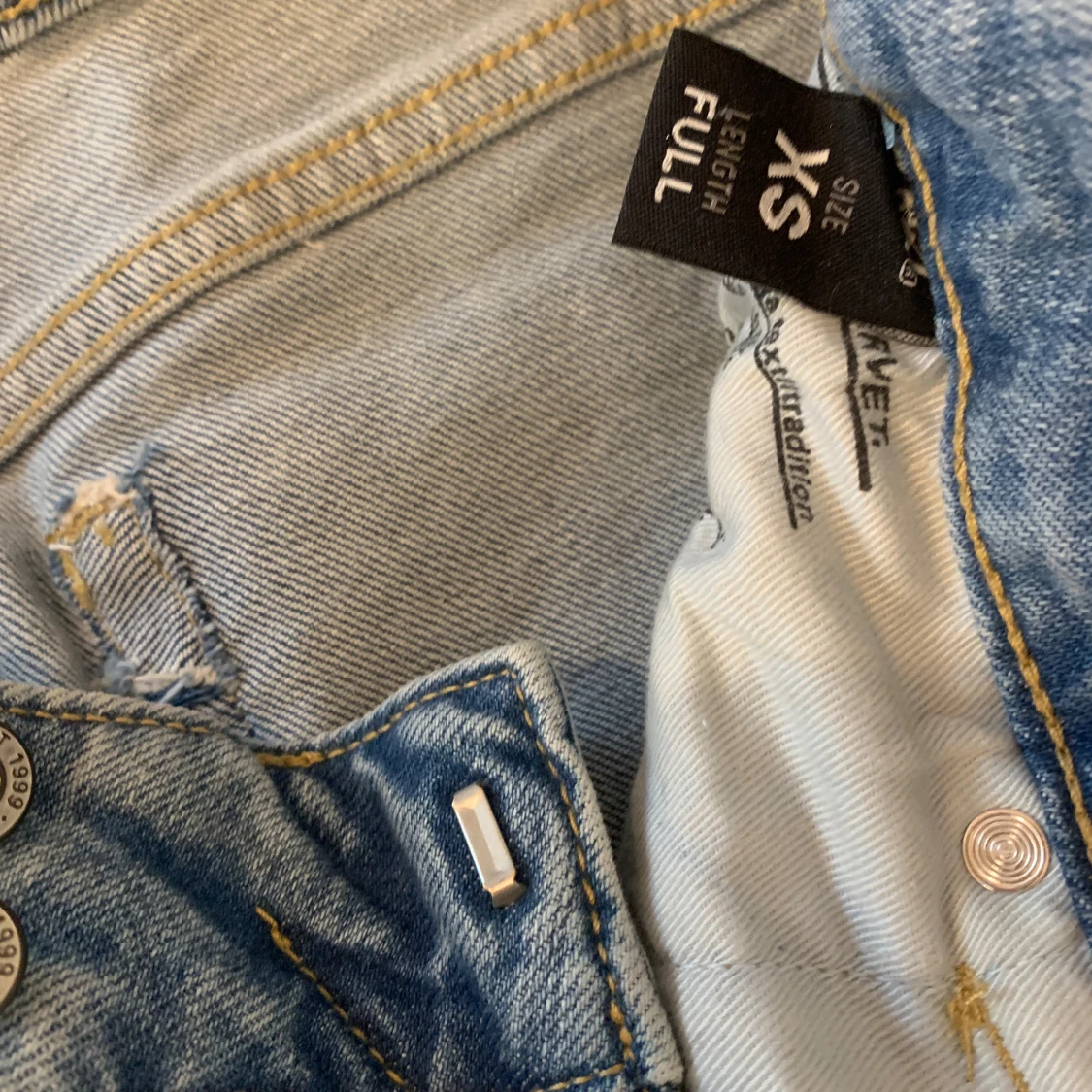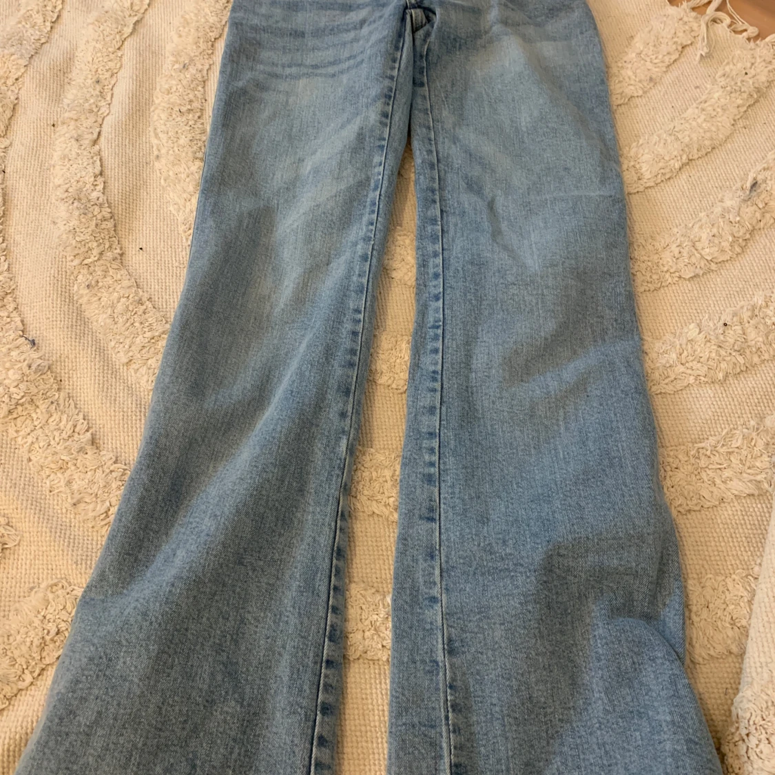 Ljusblå low waist bootcut jeans med broderade fickor