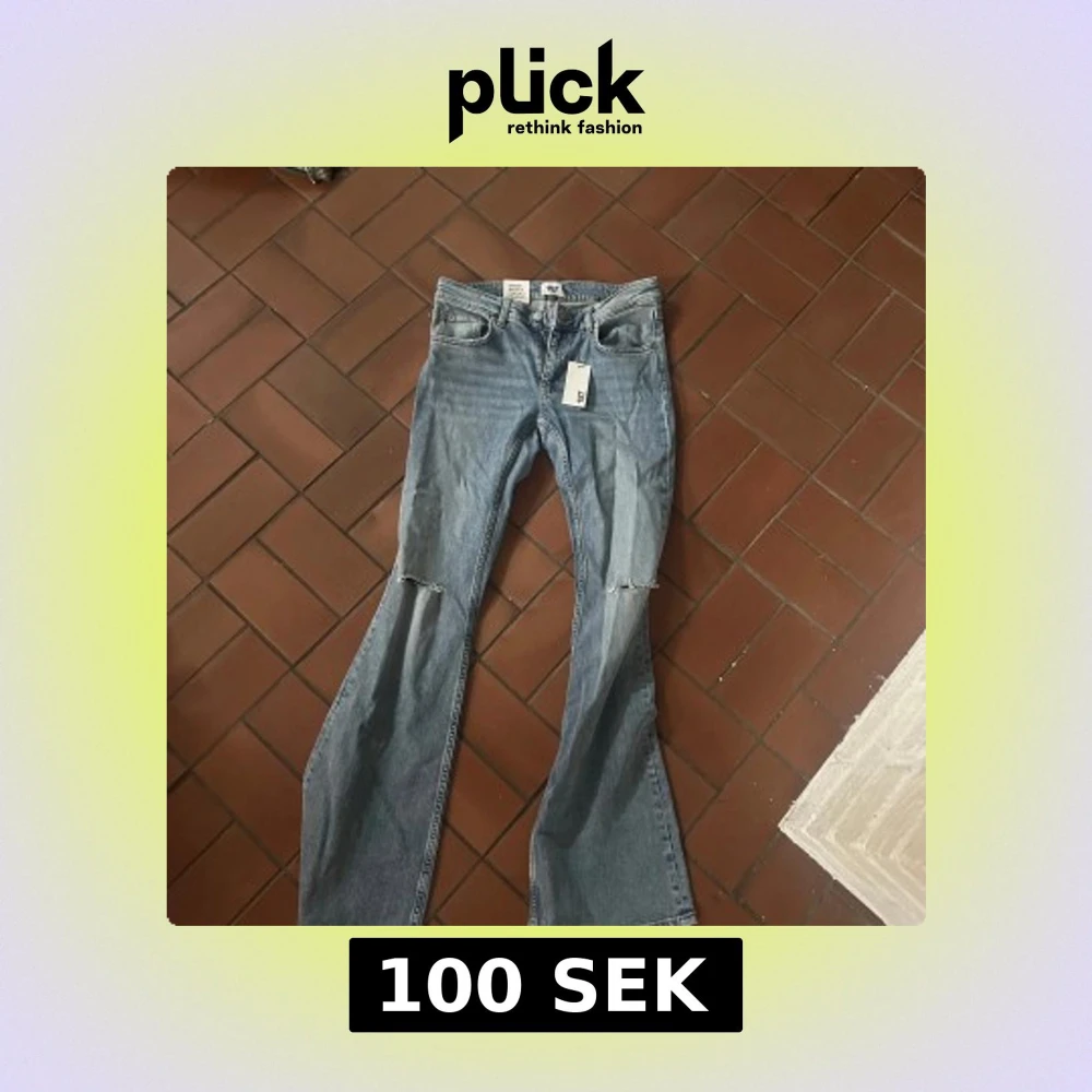 Snygga blå jeans från 157 med bootcut passform och medelhög midja. Jeansen har slitna detaljer vid knäna. Helt nya med prislapp ordernarie pris 400kr