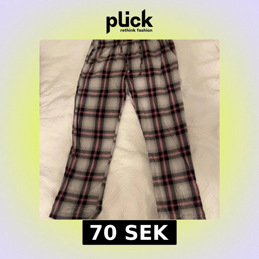 Säljer ett par rutiga pyjamasbyxor med svart, grått och rosa mönster. Byxorna har resår och snörning i midjan. Perfekt mjukisplagg