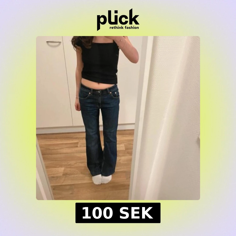 Snygga mörkblå bootcut jeans med låg midja. Jeansen har en klassisk femficksdesign och stängs med dragkedja och knapp. Säljes pga blivit för stora. De är även uppsydda för att passa mig som är ca 160, men som man kan se på bilderna är detta något som man enkelt kan spräcka upp själv utan att det syns, ifall man skulle vilja ha de längre!