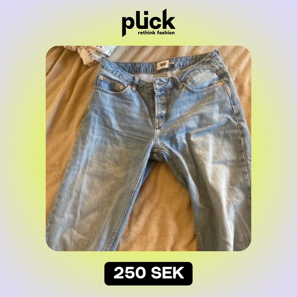 Ljusblå lågmidjade jeans från lager 157. Liten fläck på ena knäet som man kan se på sista bilden.