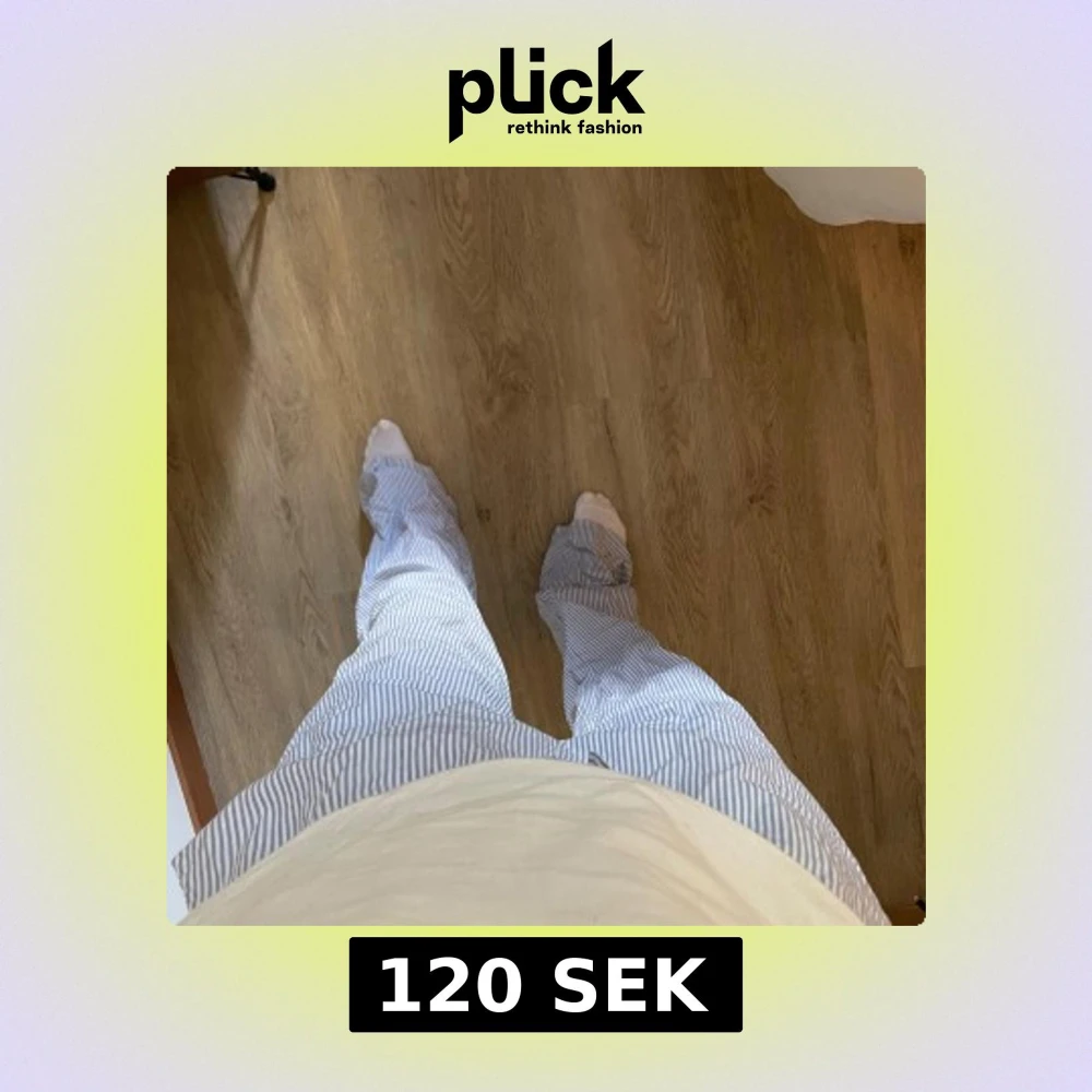 Säljer ett par lösa och bekväma pyjamasbyxor med blåvita ränder och snörning i midjan. Byxorna har en relaxed fit och är perfekta för chill dagar hemma. Tillverkade i mjukt bomullstyg för extra komfort.