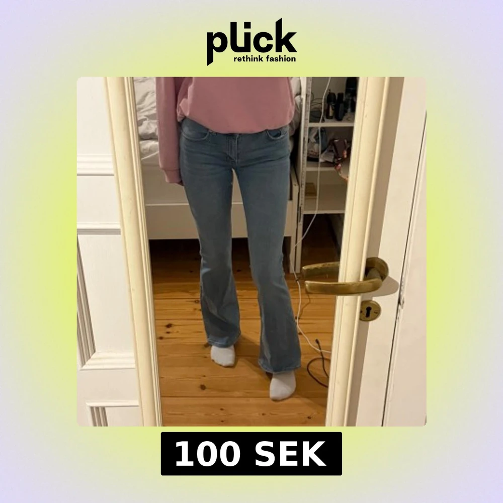 Blåa bootcut jeans med hyfsat låg midja. Inte alls mycket använda. Jag är 1,75cm lång.