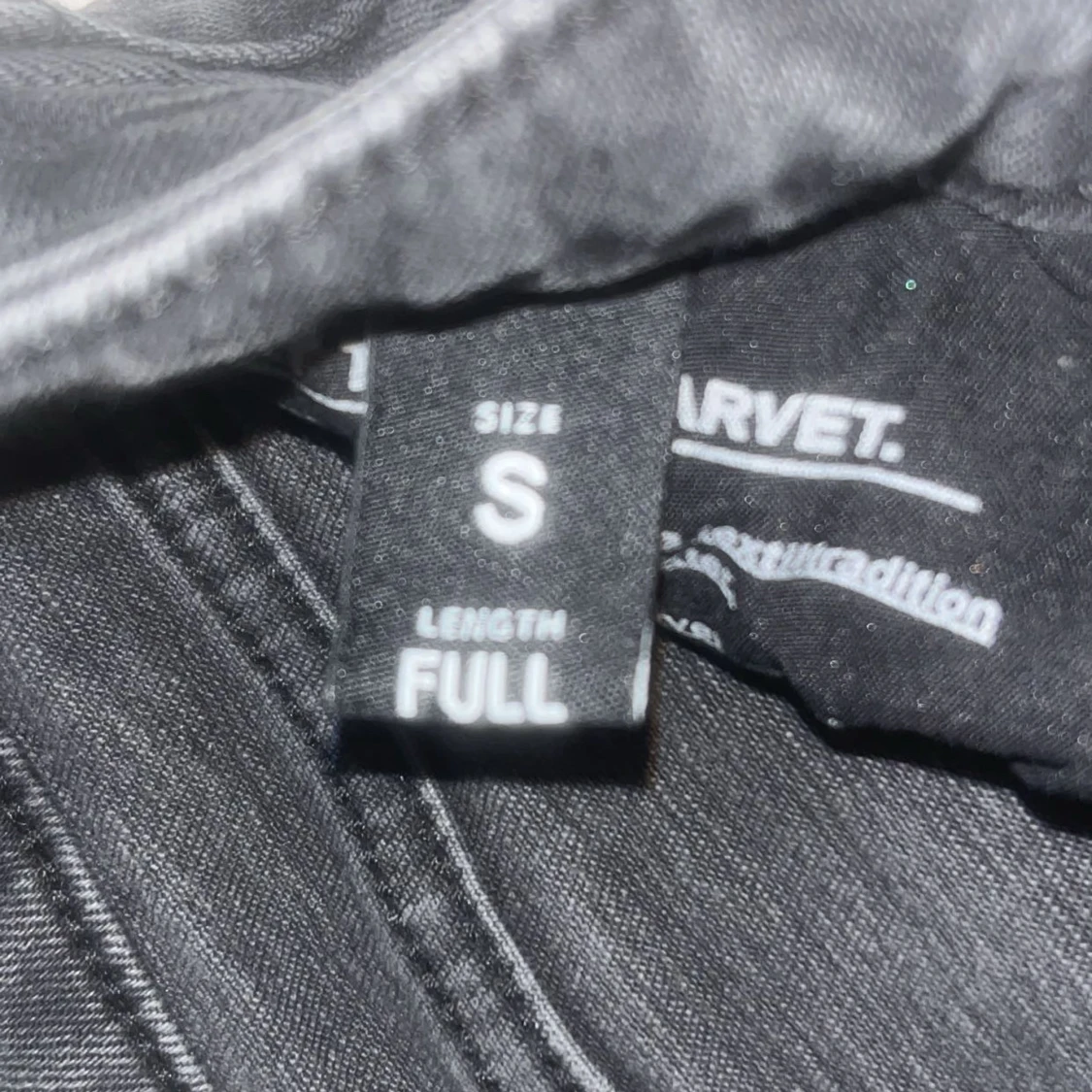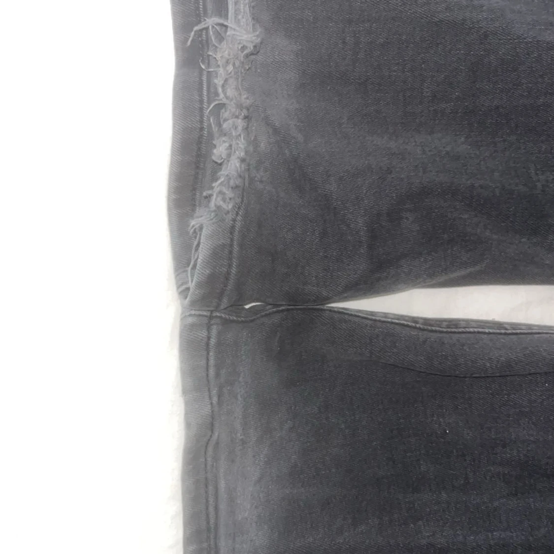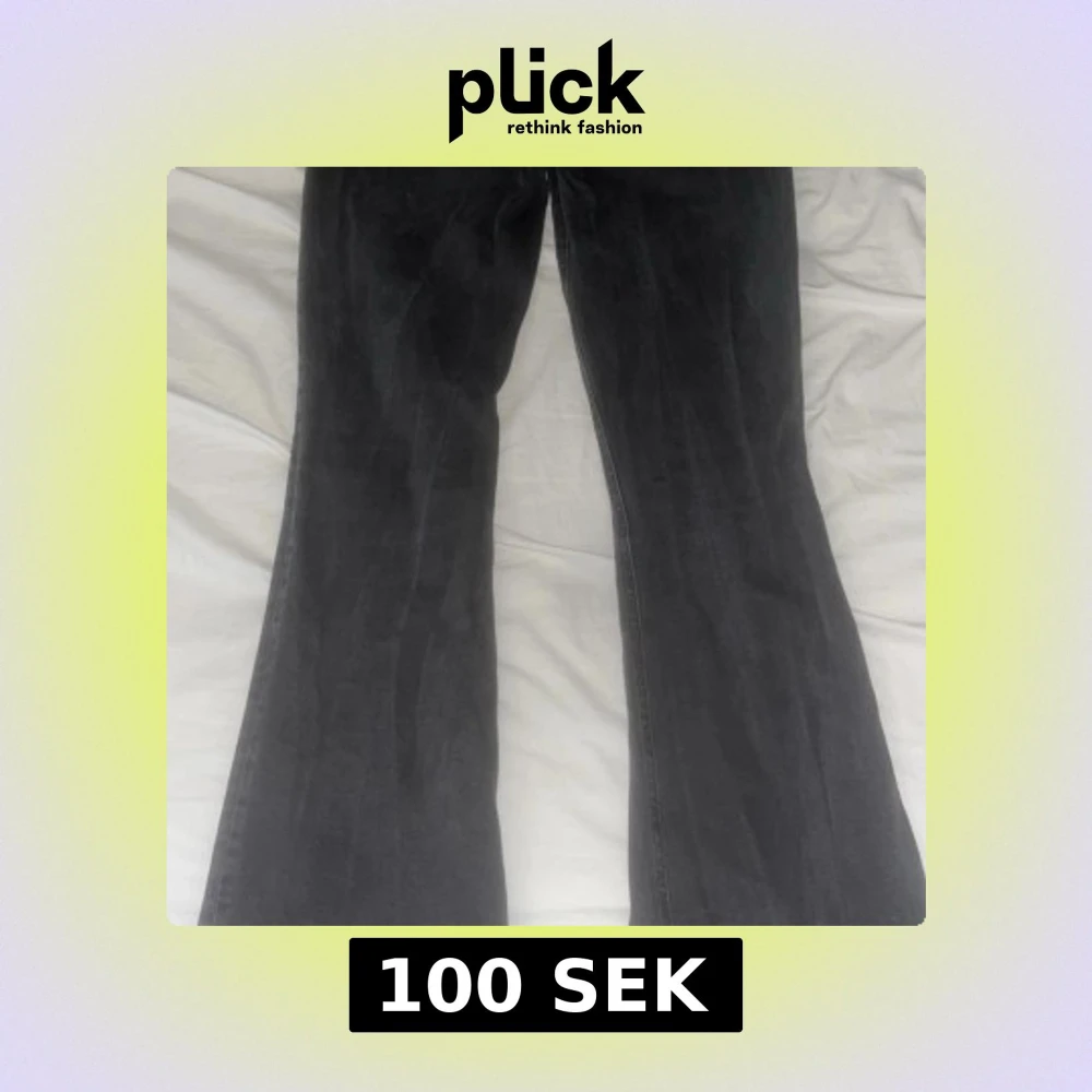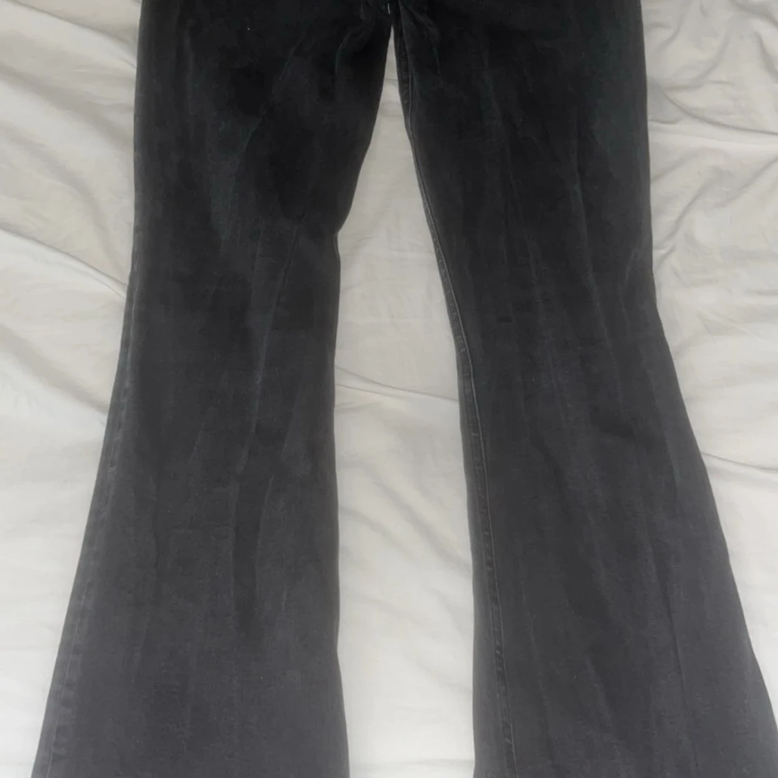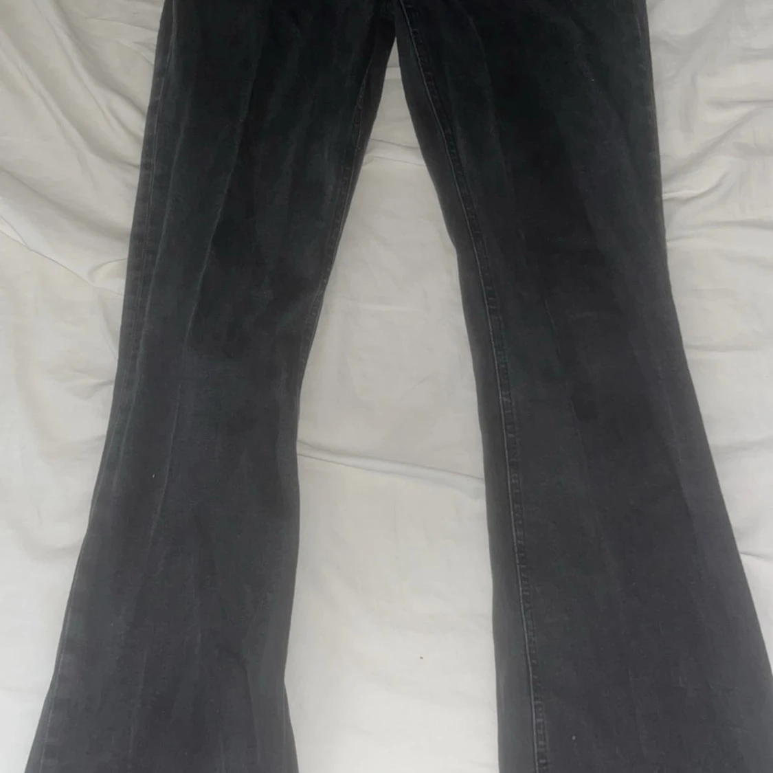 Säljer ett par svarta bootcut jeans från Lager 157 i storlek S. Jeansen har full längd och är tillverkade i klassiskt denimtyg. De har en snygg utsvängd passform nertill och råa, slitna detaljer vid benslutet för en cool look. Lite trasiga längst ned på ena sidan.