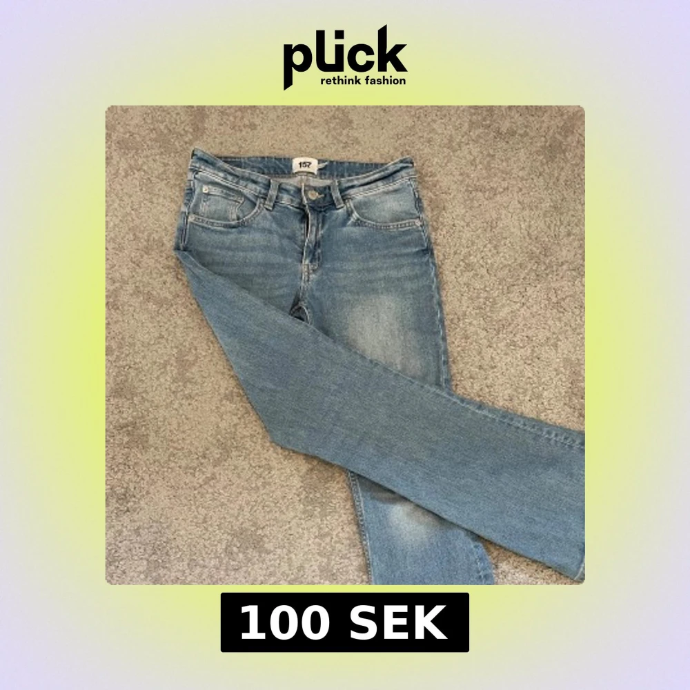 Snygga ljusblå jeans från 157 i bootcut-modell med låg midja. Klassisk femficksdesign och lätt tvättad look. Perfekta för dig som gillar en avslappnad och trendig stil. Tillverkade i mjukt jeanstyg för skön känsla hela dagen. Jeansen har tyvärr ingen bra lapp så jag kan inte se storleken, men skulle gissa på S! Jag är runt 156 cm och dem passar perfa i längden!!❣️❣️