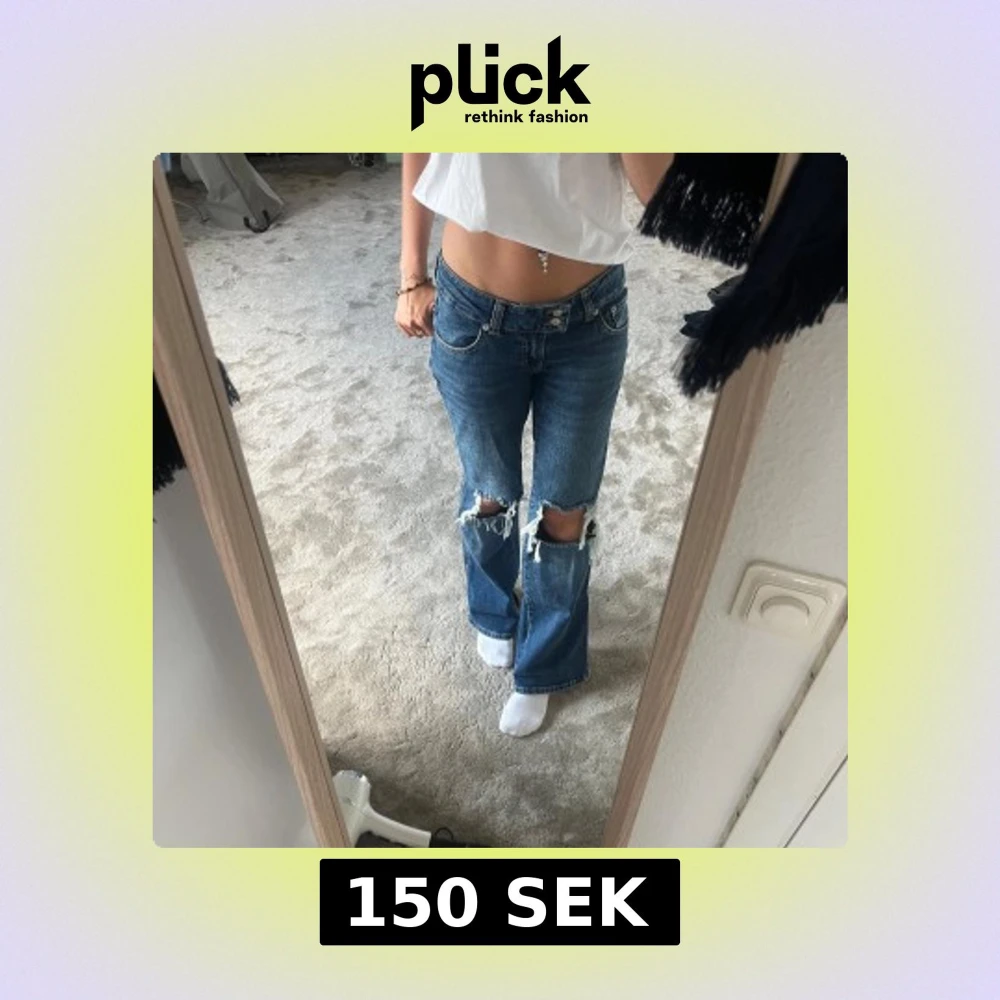 Säljer ett par blå bootcut jeans med låg midja och stora slitningar över båda knäna. Jeansen har klassisk femficksdesign och är gjorda i denim med snygg tvätt. Perfekta för dig som gillar en avslappnad och trendig look.